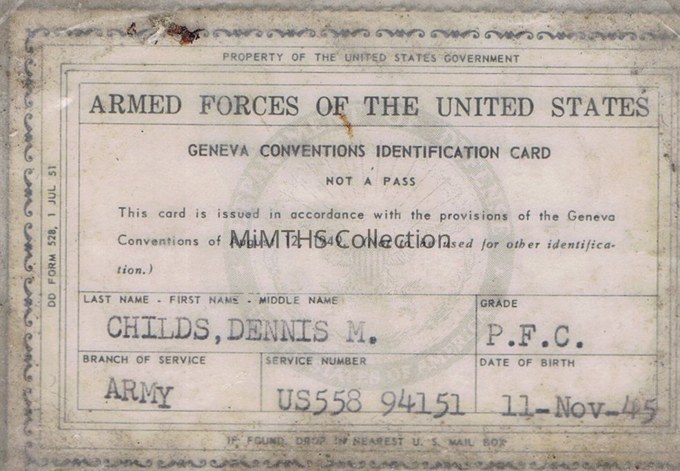 Armed Forces of the United States Geneva Convention Identification Card for Dennis Childs. 2.5x3.75in and lamenatedCataloged By
