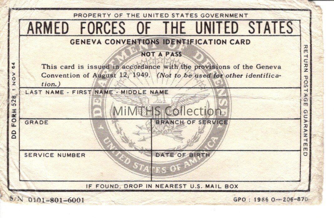 This card is issued in accordance with the provisions of the Geneva convention of august 12, 1949.Cataloged By