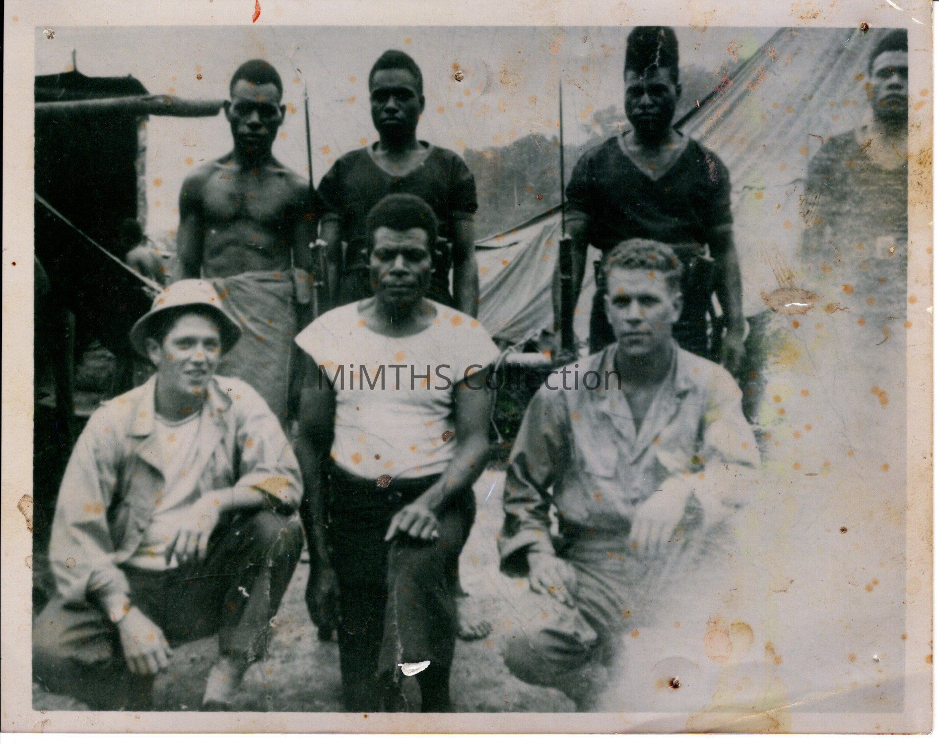 Photo of two US soldiers posing with four local natives, possibly on New Guinea.