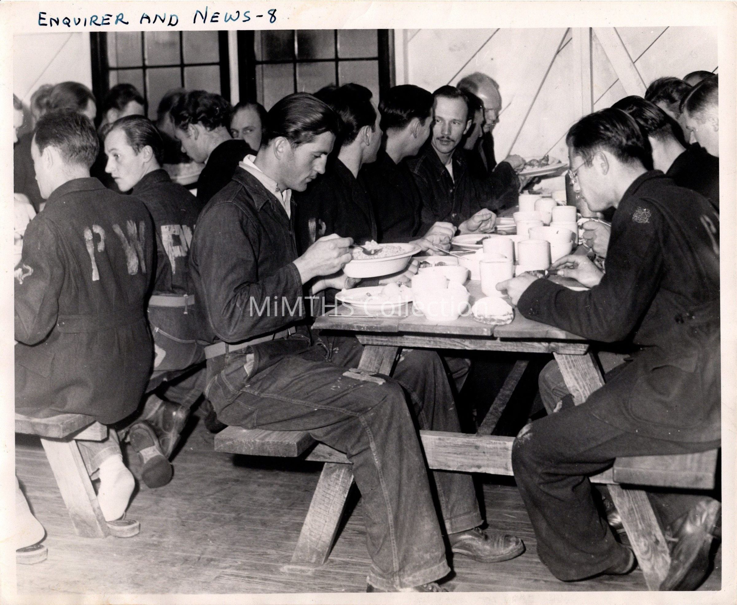 Eating's Serous Business --- German Prisoners of war at Fort Custer fall to at the mess table for their noonday meal. The Germans, although shorter generally than Americans, are wiry and tough, and like all active young men, they appreciate good food. Their favorite foods seem to be potatoes and pastries and the don't care much for meat. Officers in charge of the prisoners say the Germans are very clean in their preparation of foods and that they waste nothing which can be used.Photograph Details