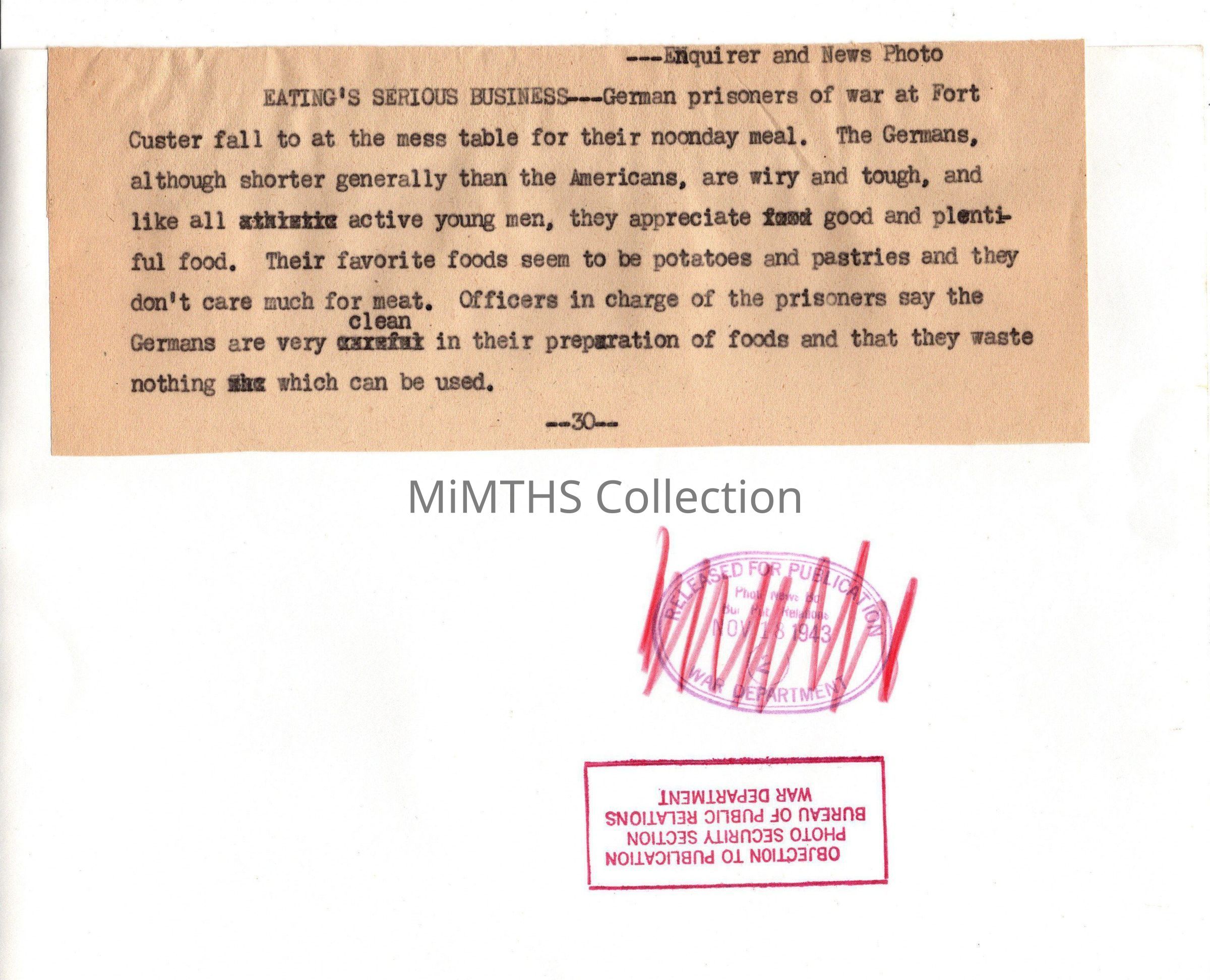 It appears the photo passed the censor on November 18, 1943, but had the publication rescinded by objection from the Photo Security Section, Bureau of Public Relations, War Department.