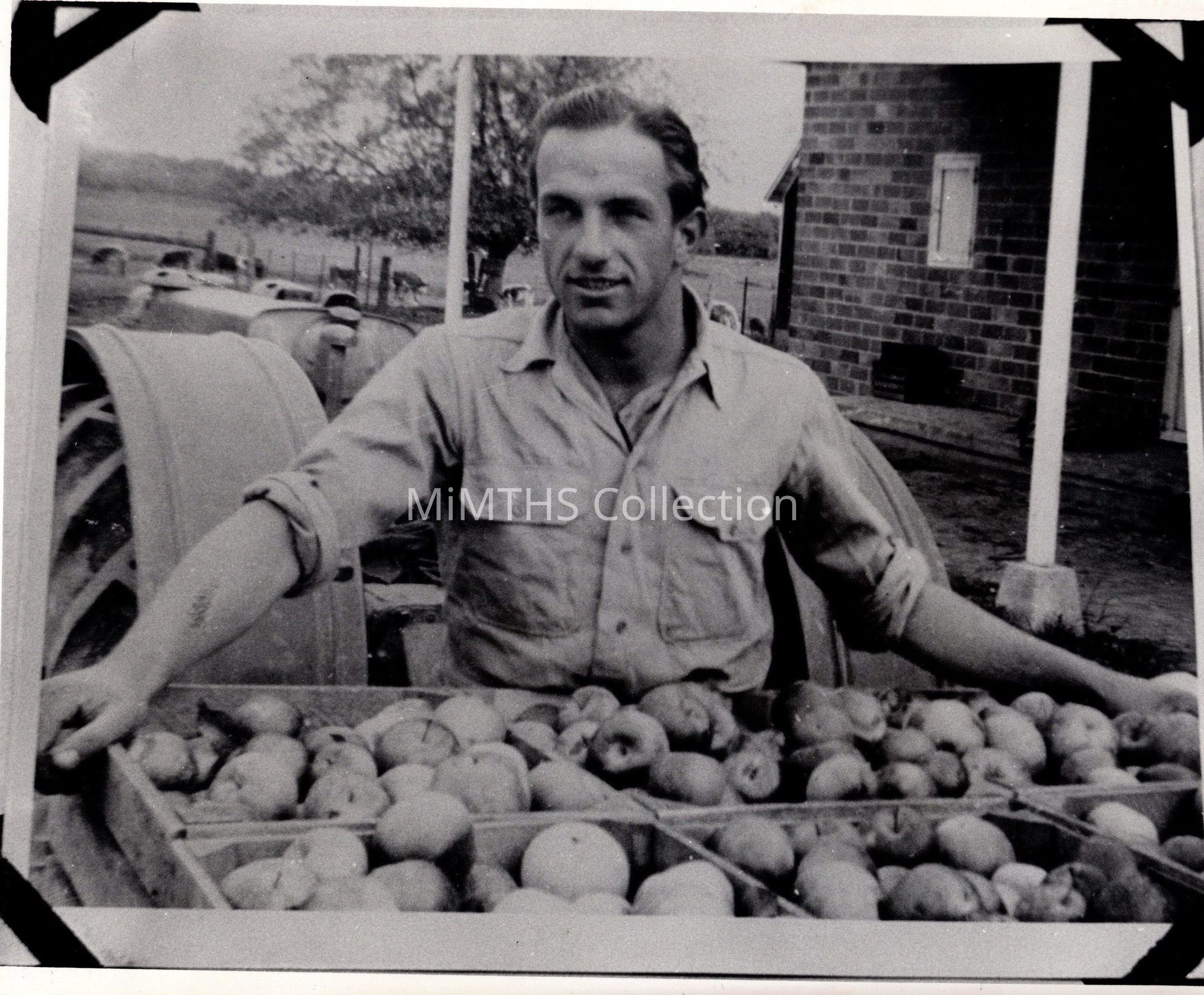 8"x10" Glossy of Roland Detsel with a bushel of apples at Kraft Orchards near Sparta, MI. Detsel was a Afrika Korps veteran Captured in Tunisia. Kraft Orchard had 10 POW's working there.