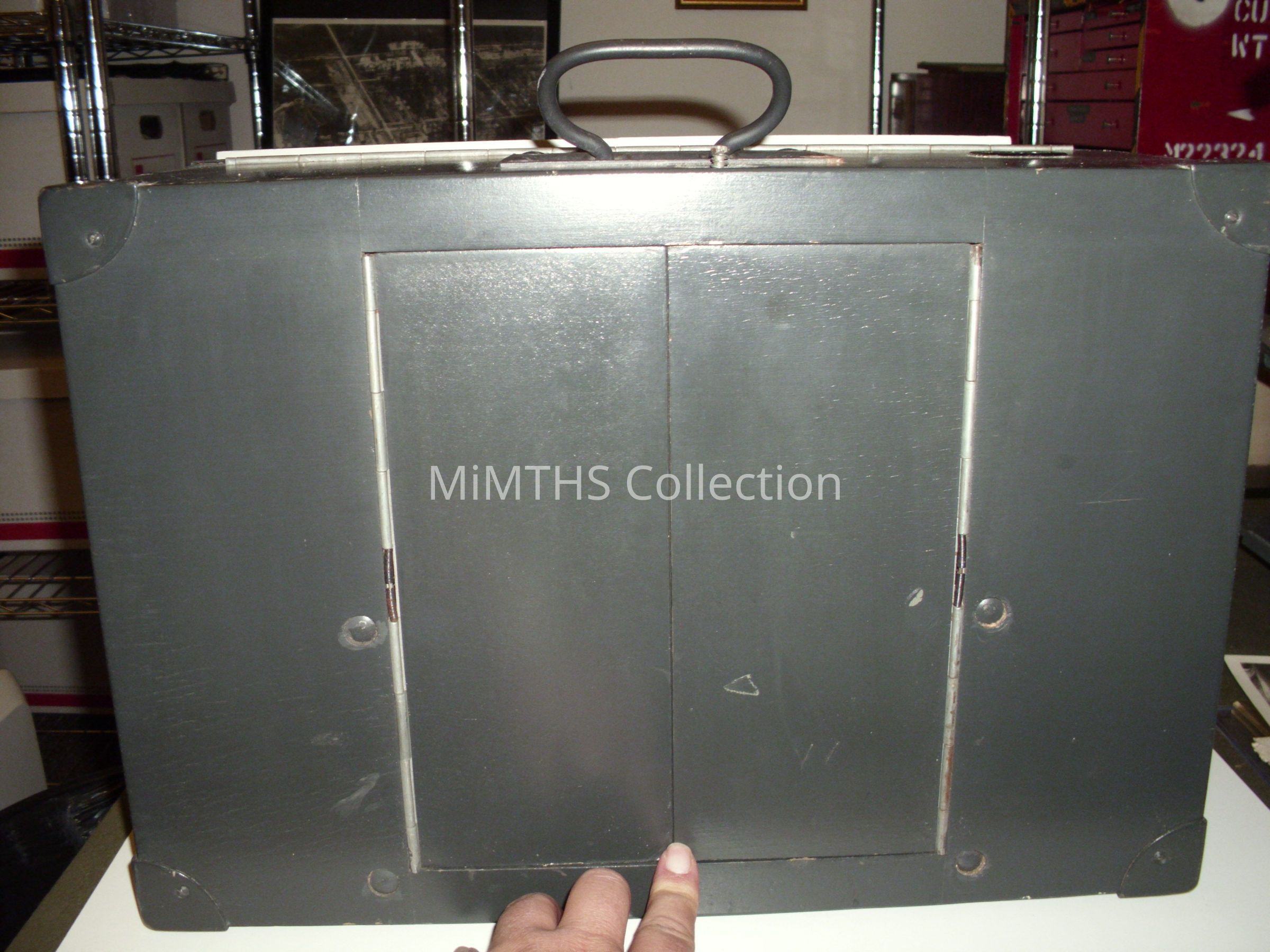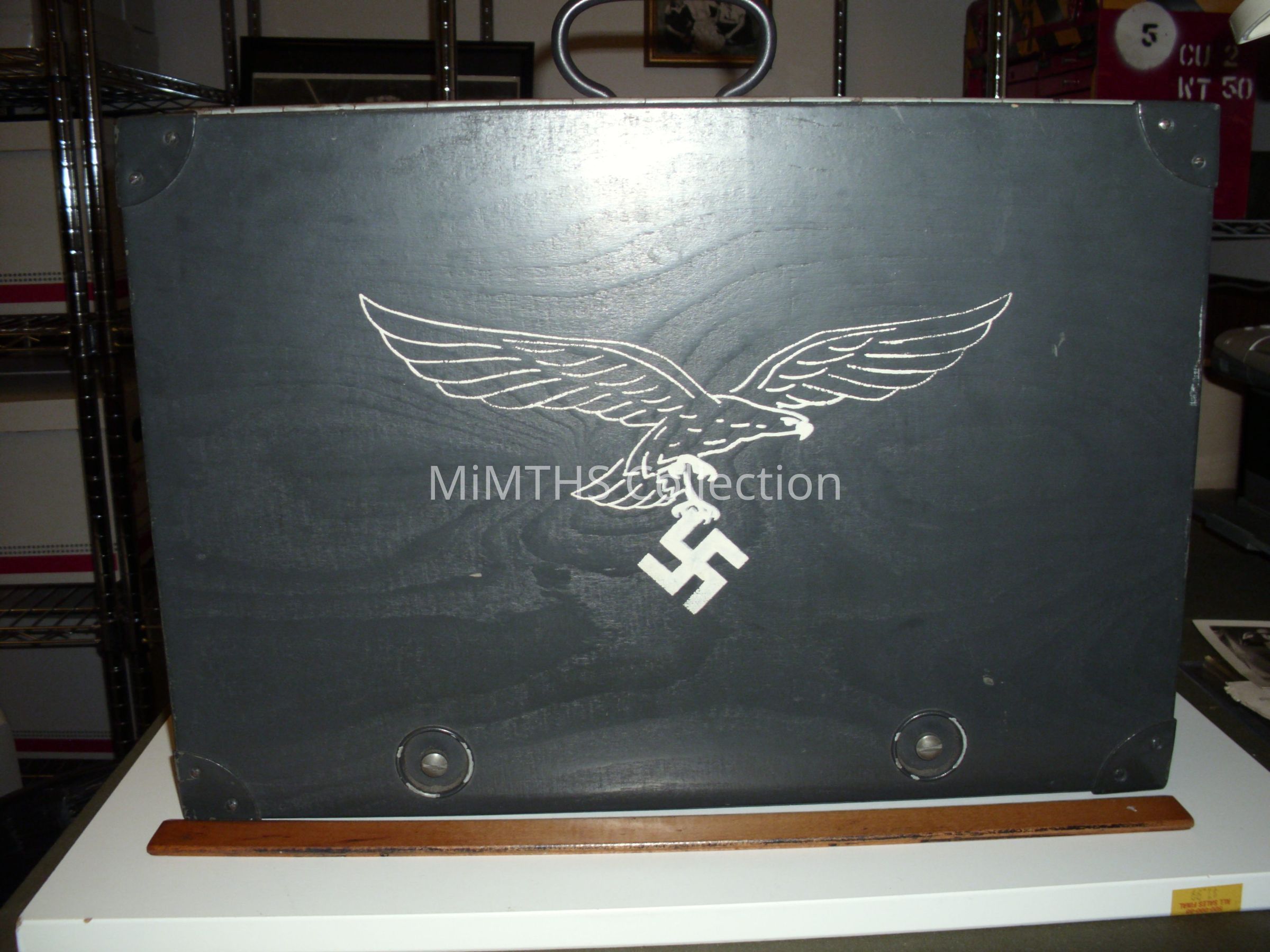 It measures 12 1/8" tall x 17 3/4" wide x 7 1/4" deep. It still retains the original deep grey/blue Luftwaffe paints over multi-panel hardwood construction, with mortised corner joints, and molded black Bakelite and metal fittings.Cataloged By