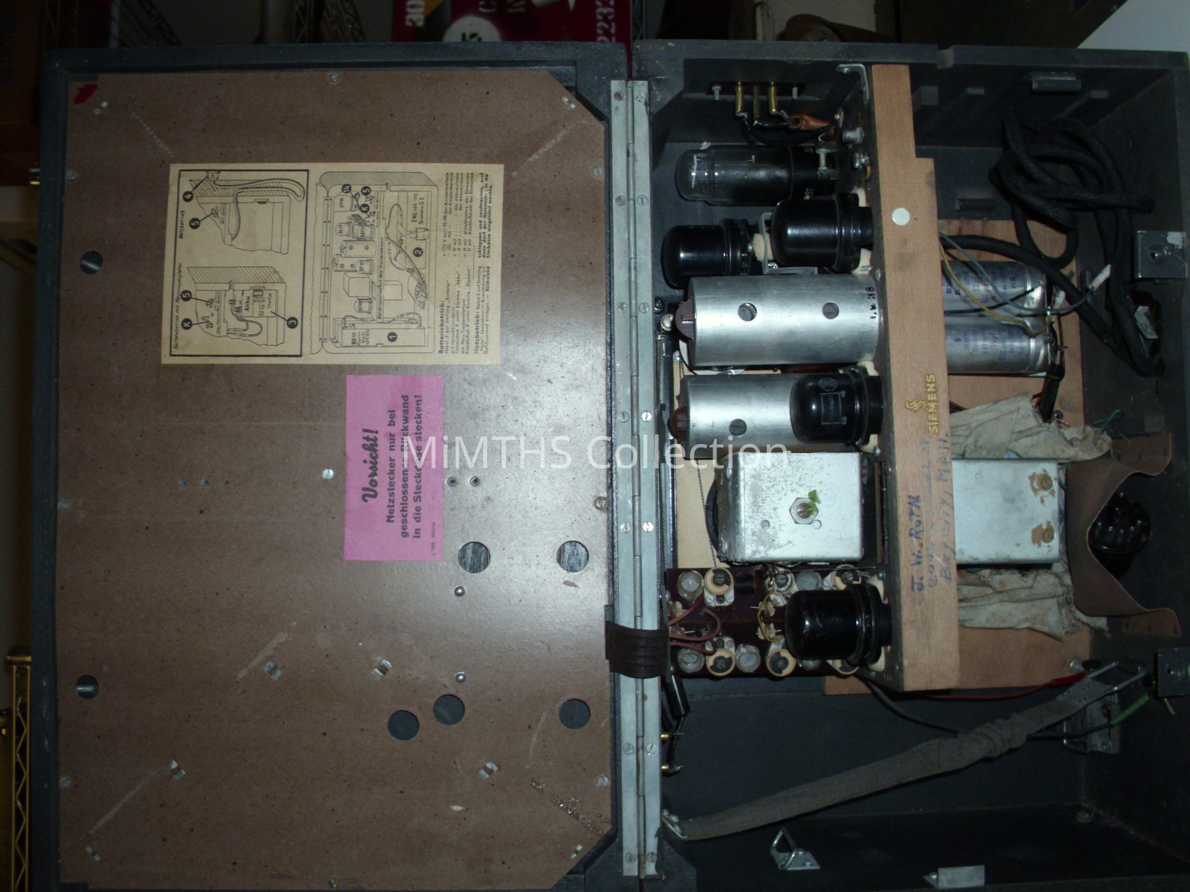 This is a Siemens model K32 GWB barracks radio, with long and short wave capabilities. It was manufactured for the Luftwaffe in 1941. It appears to be complete, with all tubes inside, plus instructions. It has a Super-Heterodyne IF-Frequency of 468khz, 6 AM tuned circuits, moving coil speaker, a permanent magnet dynamic, and ability to be powered by battery or wall outlet.