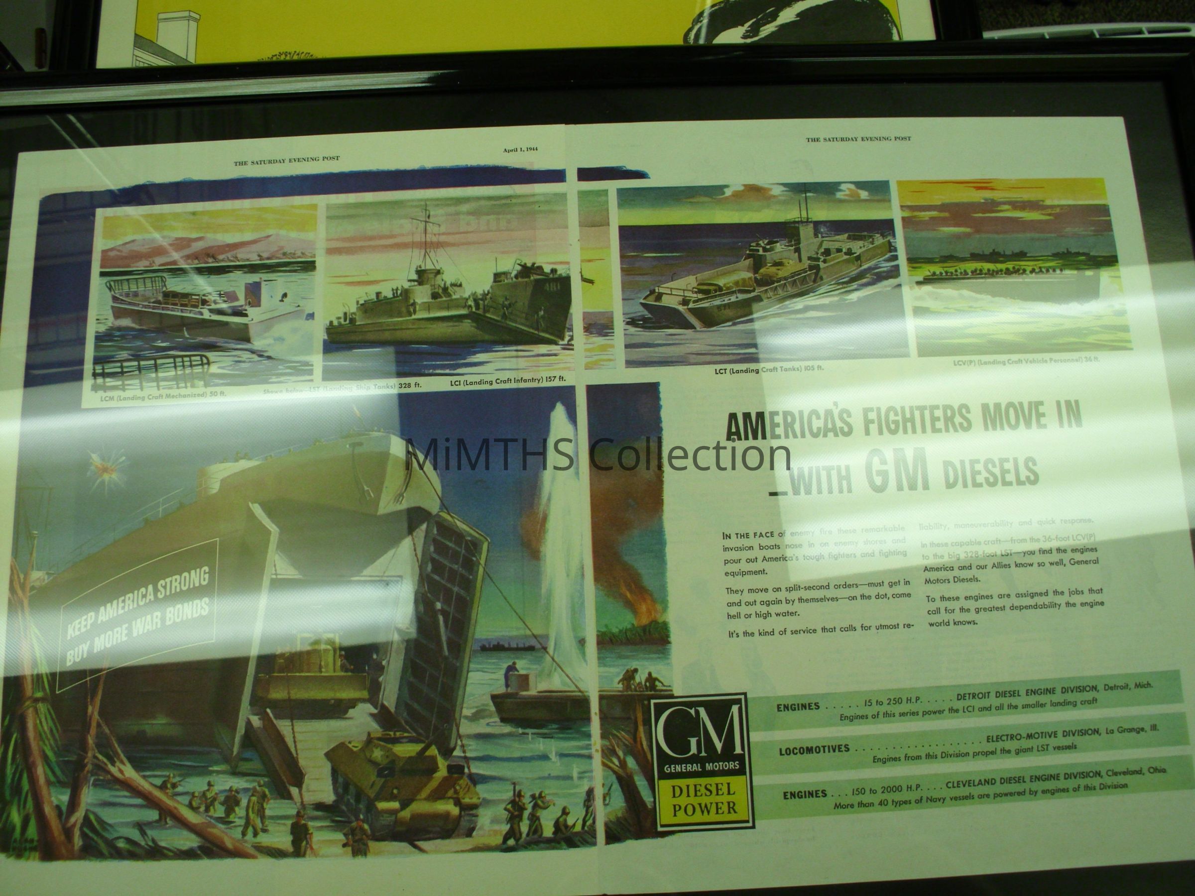 2 page ad on GM diesel engines clipped from April 1944 Saturday Evening post