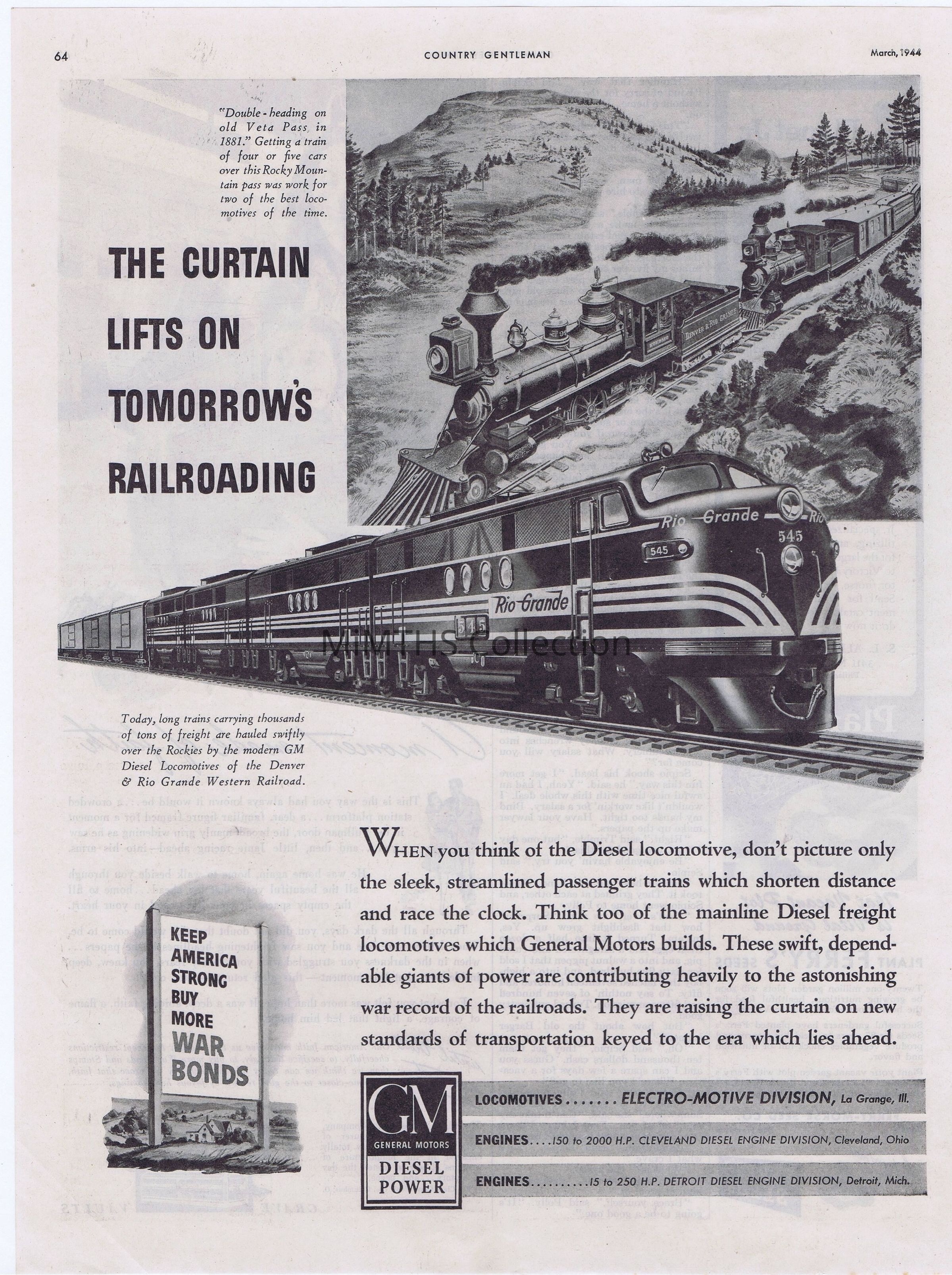 Ad clipped rom the March 1944 issue of "Country Gentleman" on the role of GM Diesel Locomotives in the war effortCataloged By