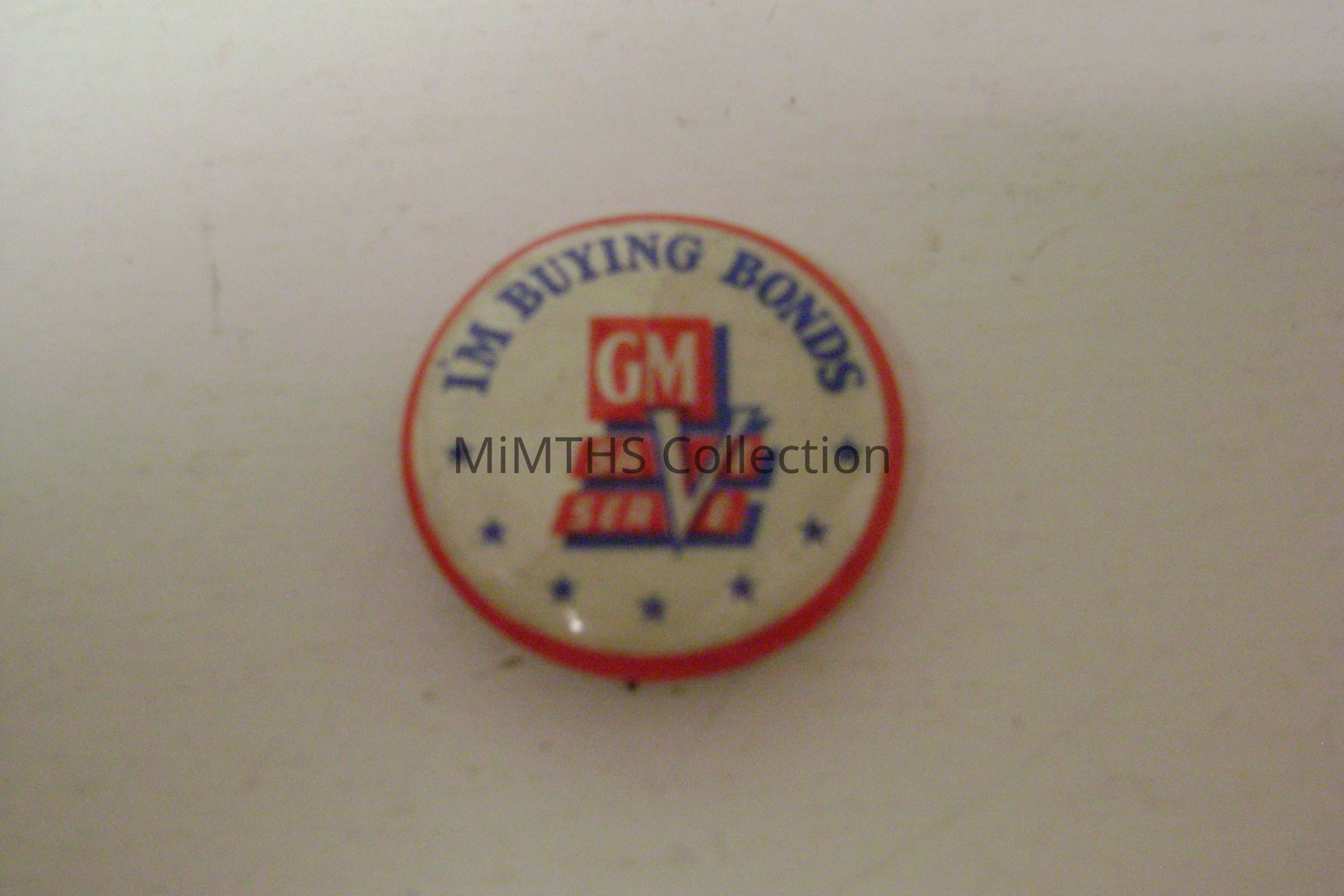 "GM Save Serve" pin with large white V and stars at bottom. "I'm buying Bonds" at top 5cm buttonCataloged By