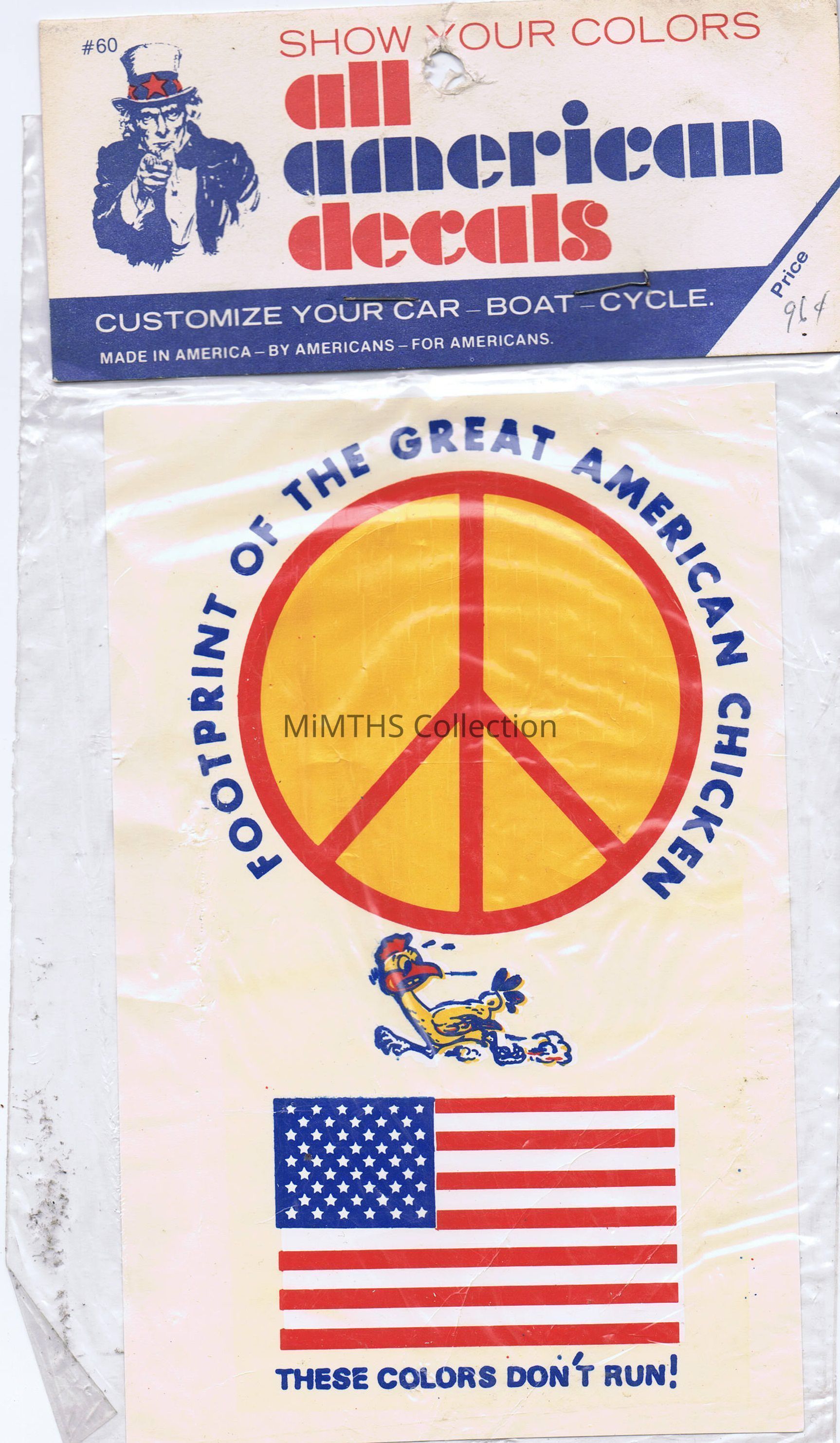 4"x7" decal with peace sign and "Footprint of the Great American Chicken" motif. Made by All American Decals, assume these are 1970's vintage.