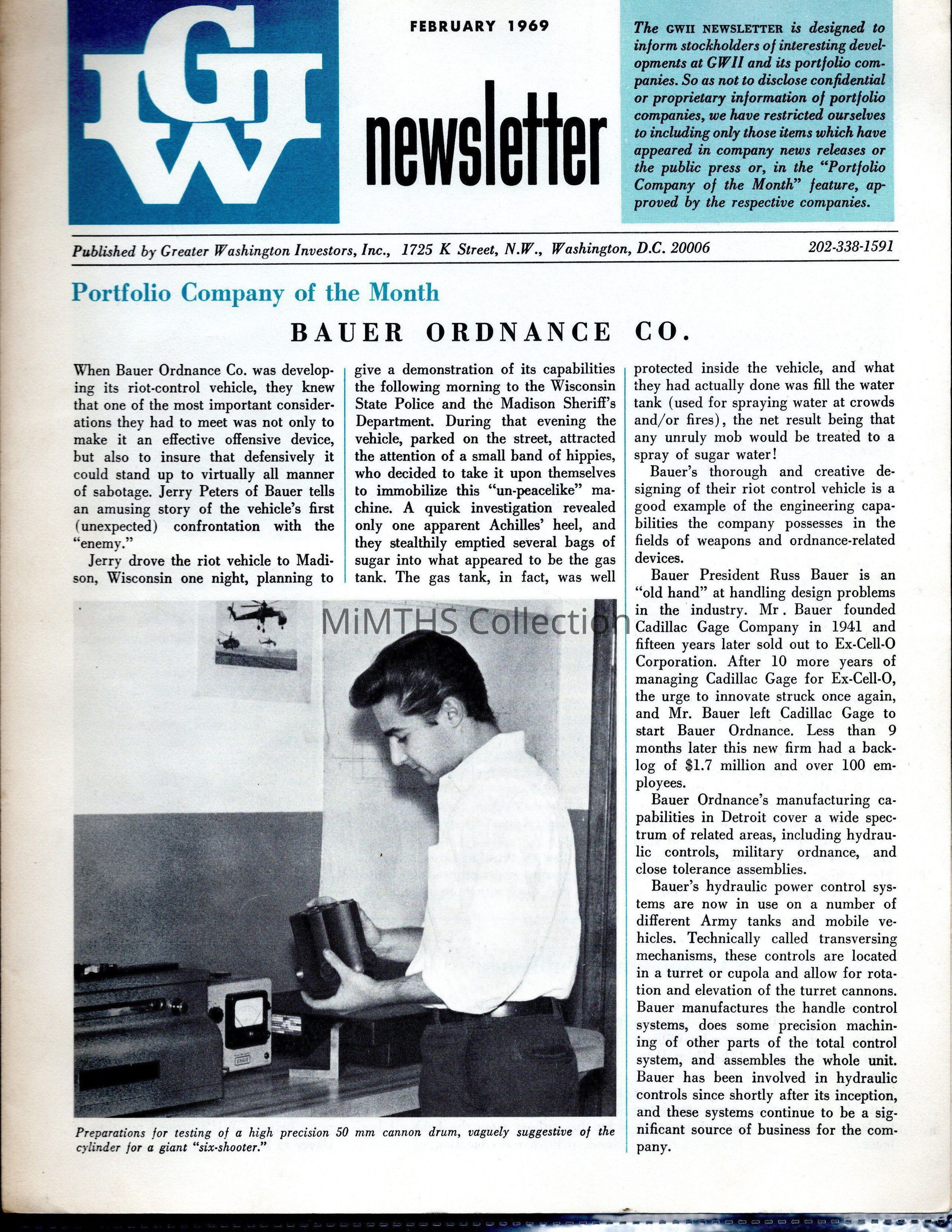 Greater Washingtons Investors Inc. newsletter featuring a report on the Bauer Ordnance Co. and their military contracts for M7 bayonets. Founder of Bauer also founded Cadillac Gage in 1941. Feb. 1969 issueCataloged By