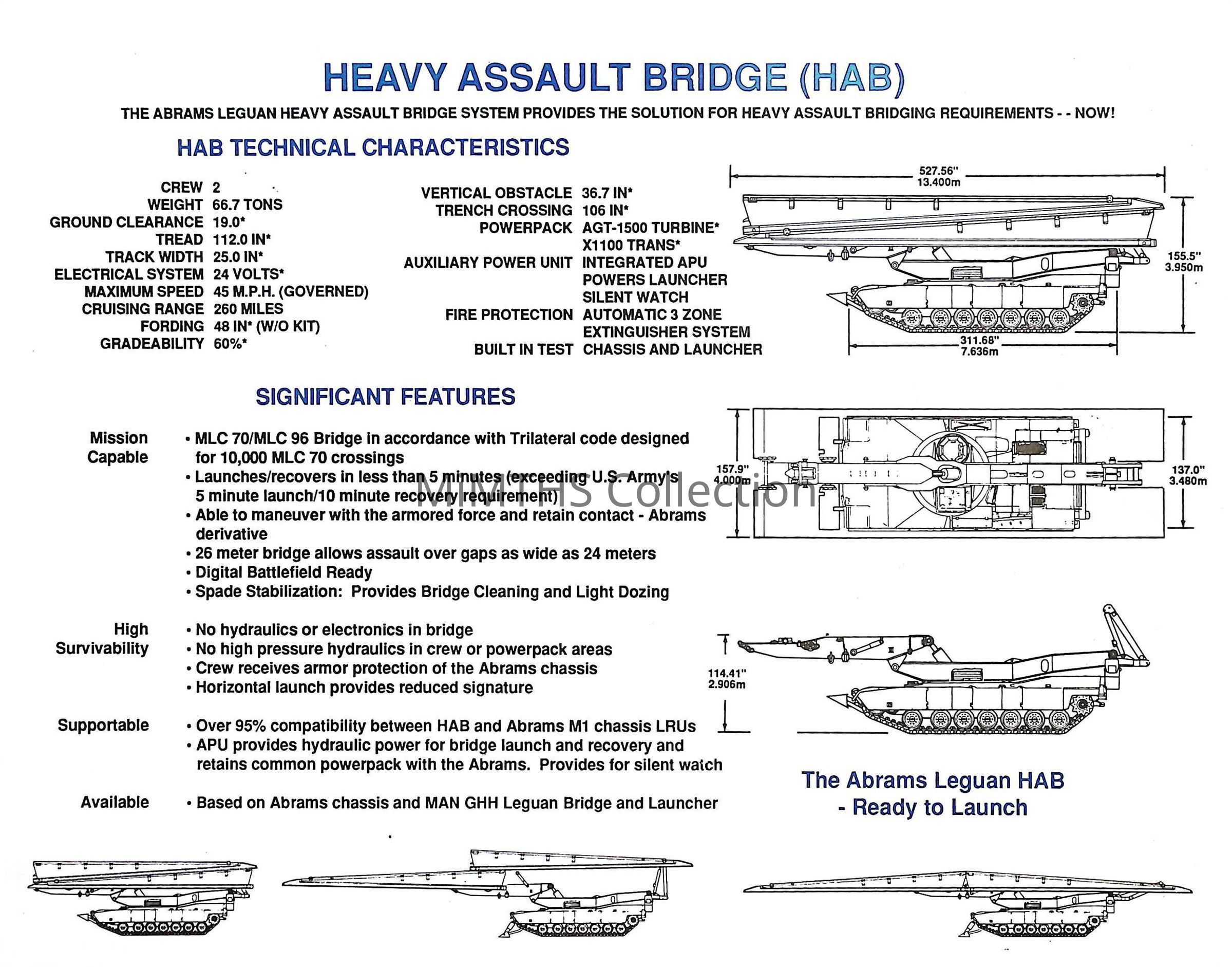 Heavy Assault Bridge (HAB), General Dynamics Land Systems Division, MAN GHH, informational sheet showing technical characteristics and significant featuresCataloged By