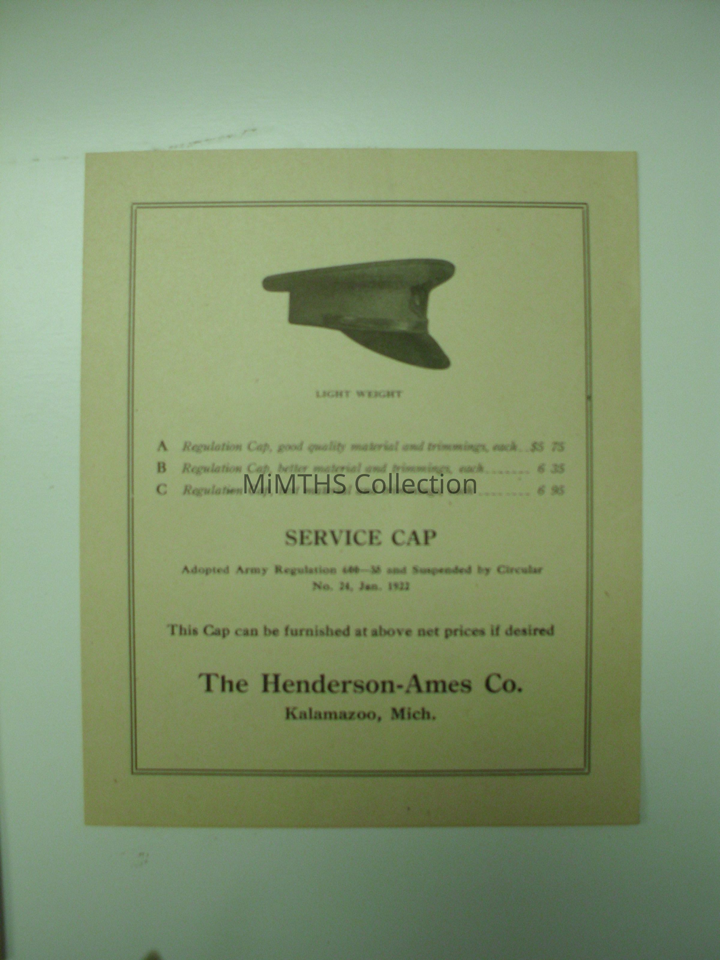 Insert to the 1923 Henderson & Ames Cata log on the lightweight service cap offered by the companyCataloged By