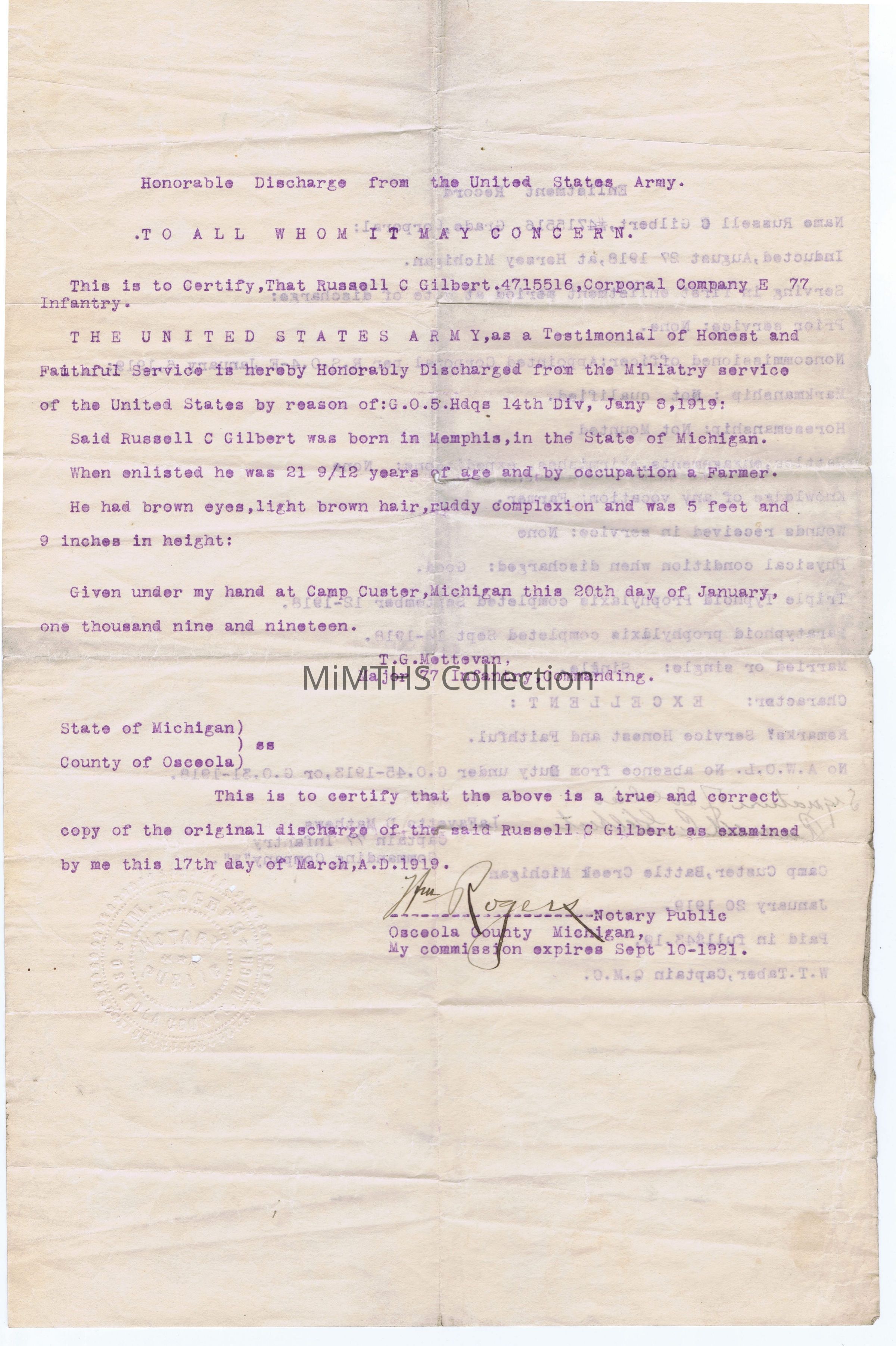 The Certifies that Russel C. Gilbert was honorably discharged from the US Army in 1919.Cataloged By