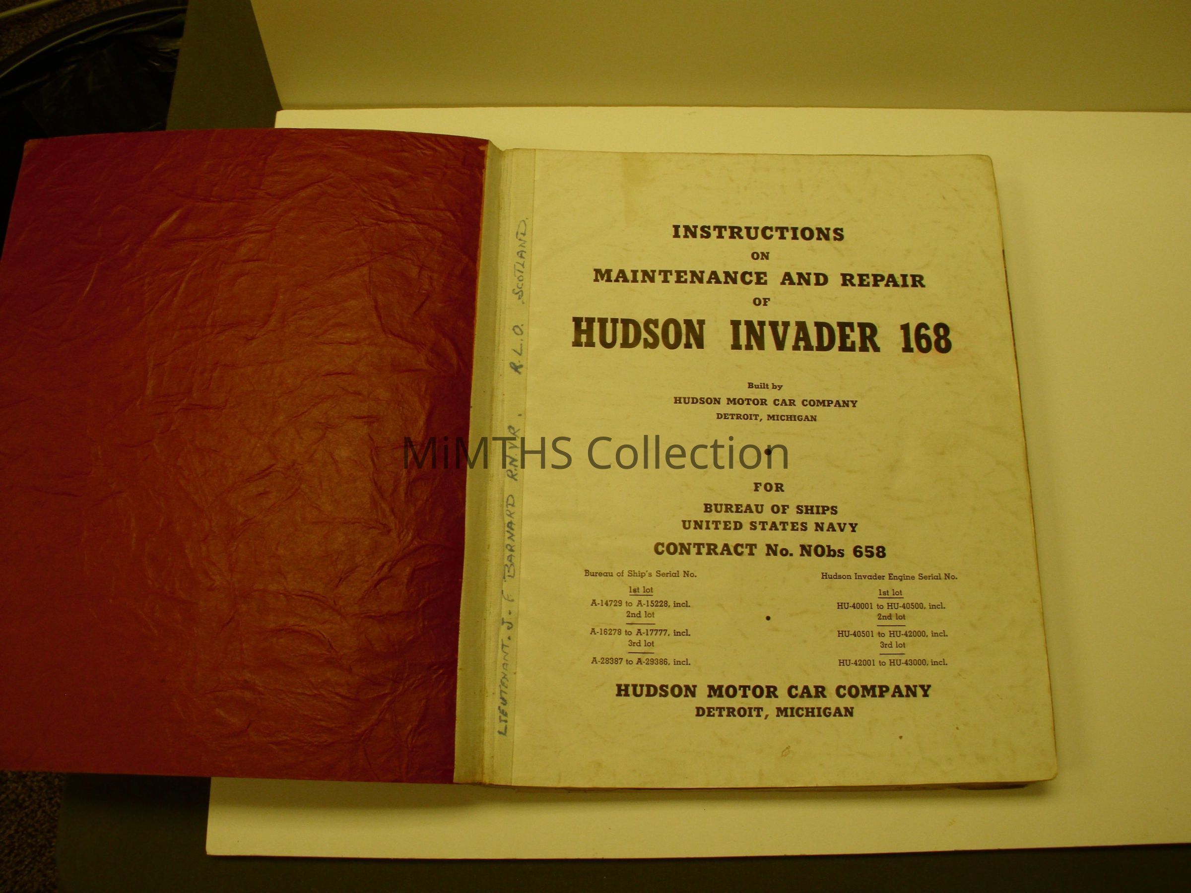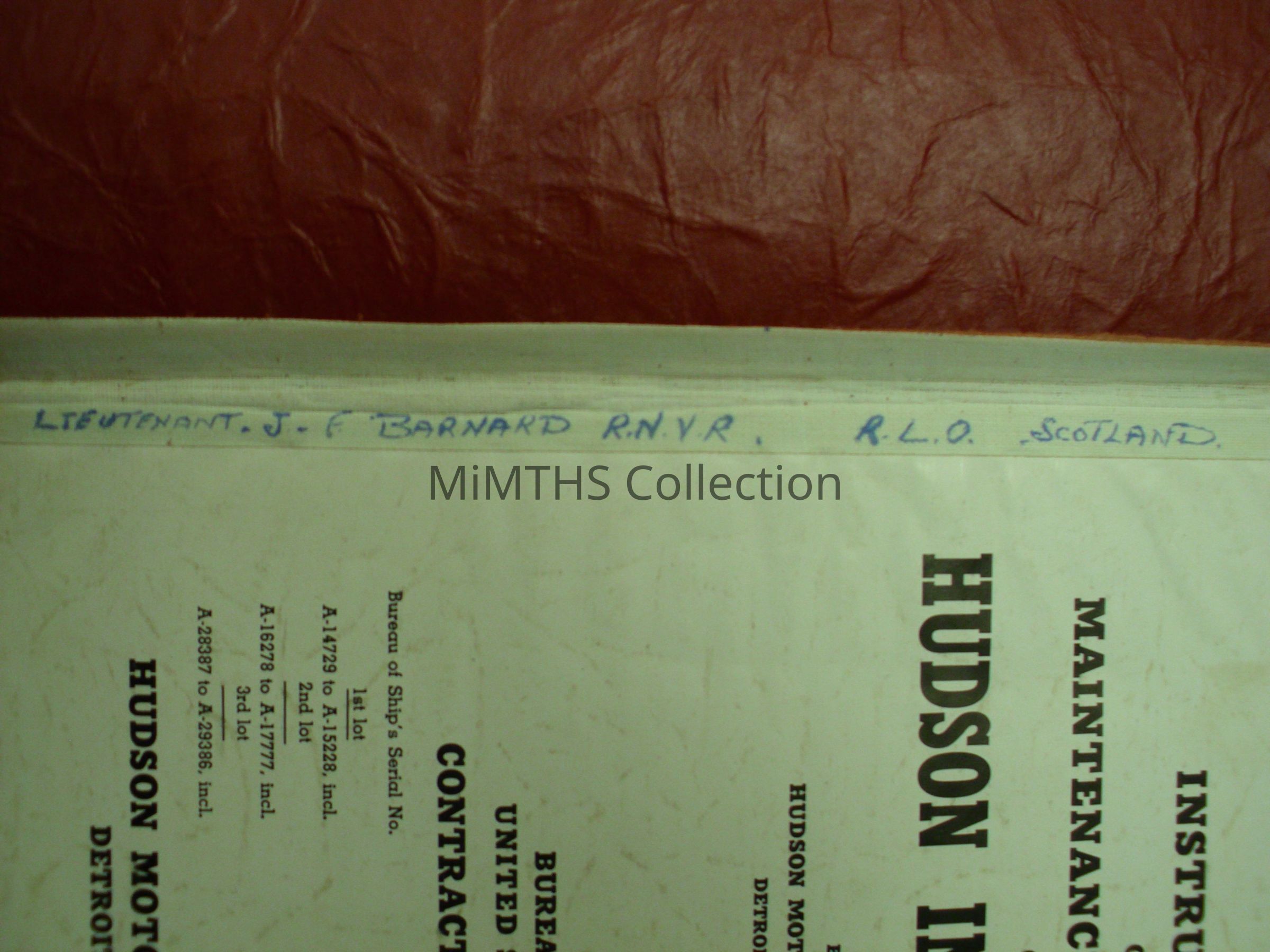 149 page long manual with red card cover named to a Lteutenant J.F. Barnard, RNVR, RLO ScotlandCataloged By