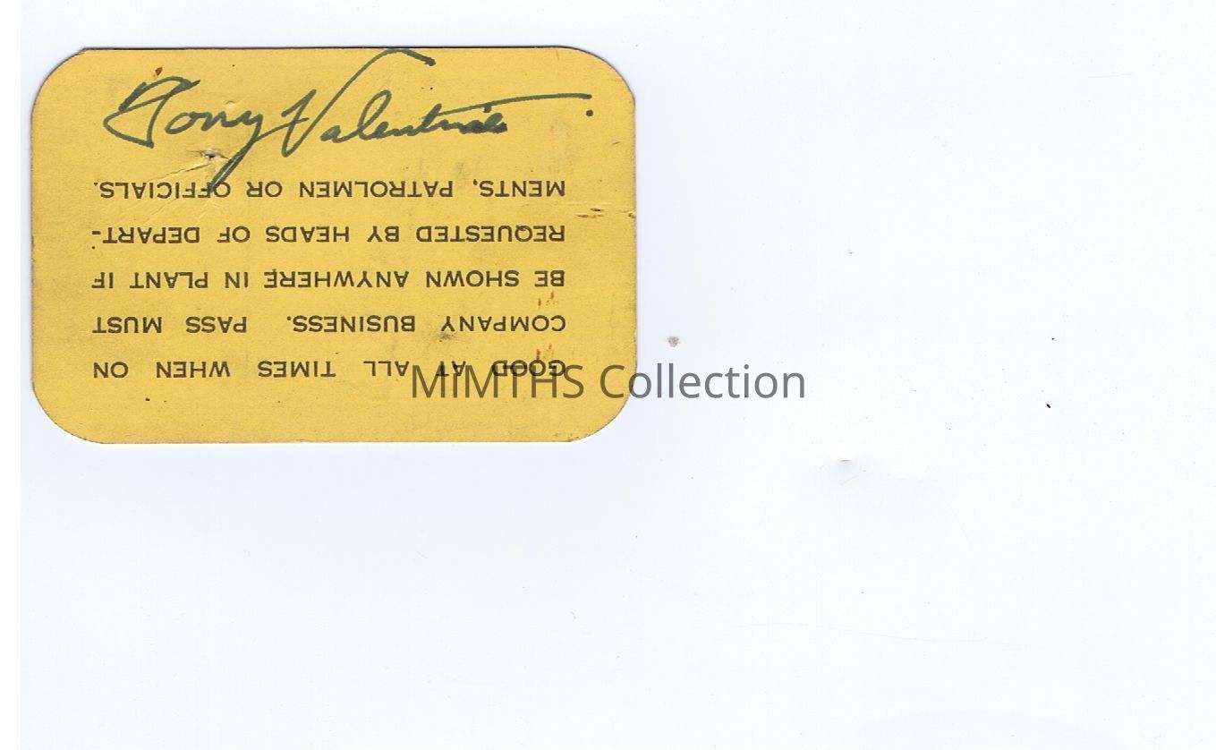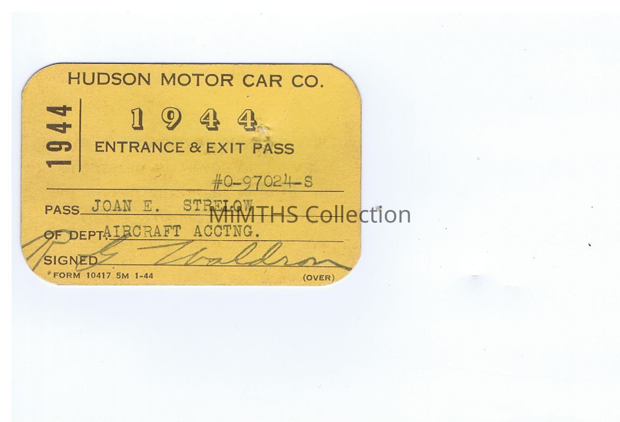 Hudson Motor Car Co 1944 Entrance & Exit Pass for Joan E Strelow, Aircraft Accounting. Card is yellow. Back: "Good at all times when on company business. Pass must be shown anywhere in plant if requested by heads of departments, patrolmen or officials"Acquisition