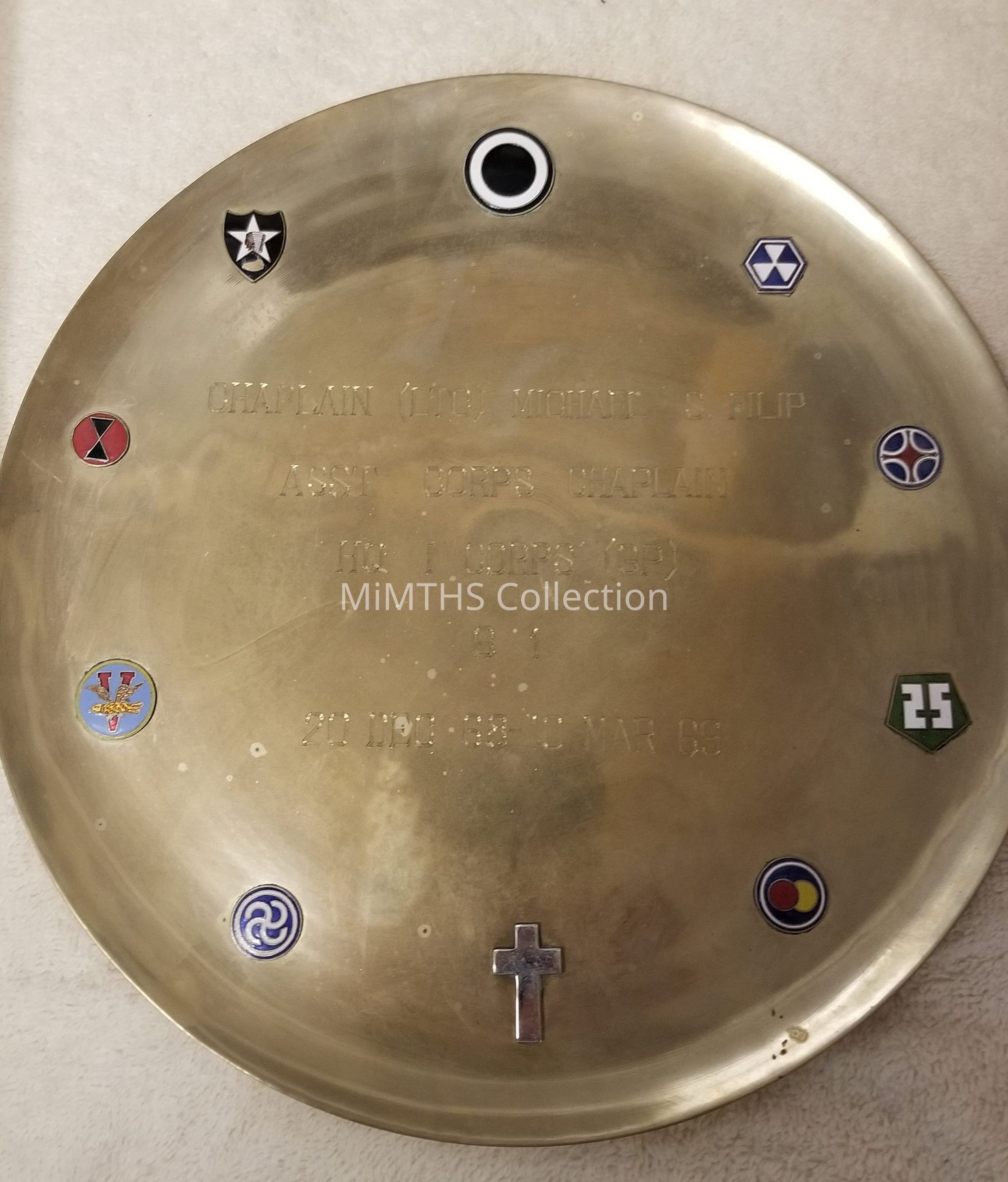 10.25" round brass wall plaque inscribed "Chaplain (LTC) Michael S. Filip Asst Corps Chaplain HQ I Corps (GP) 20 Dec 68- 10 Mar 69" Has 9 DUI's around perimeterCataloged By