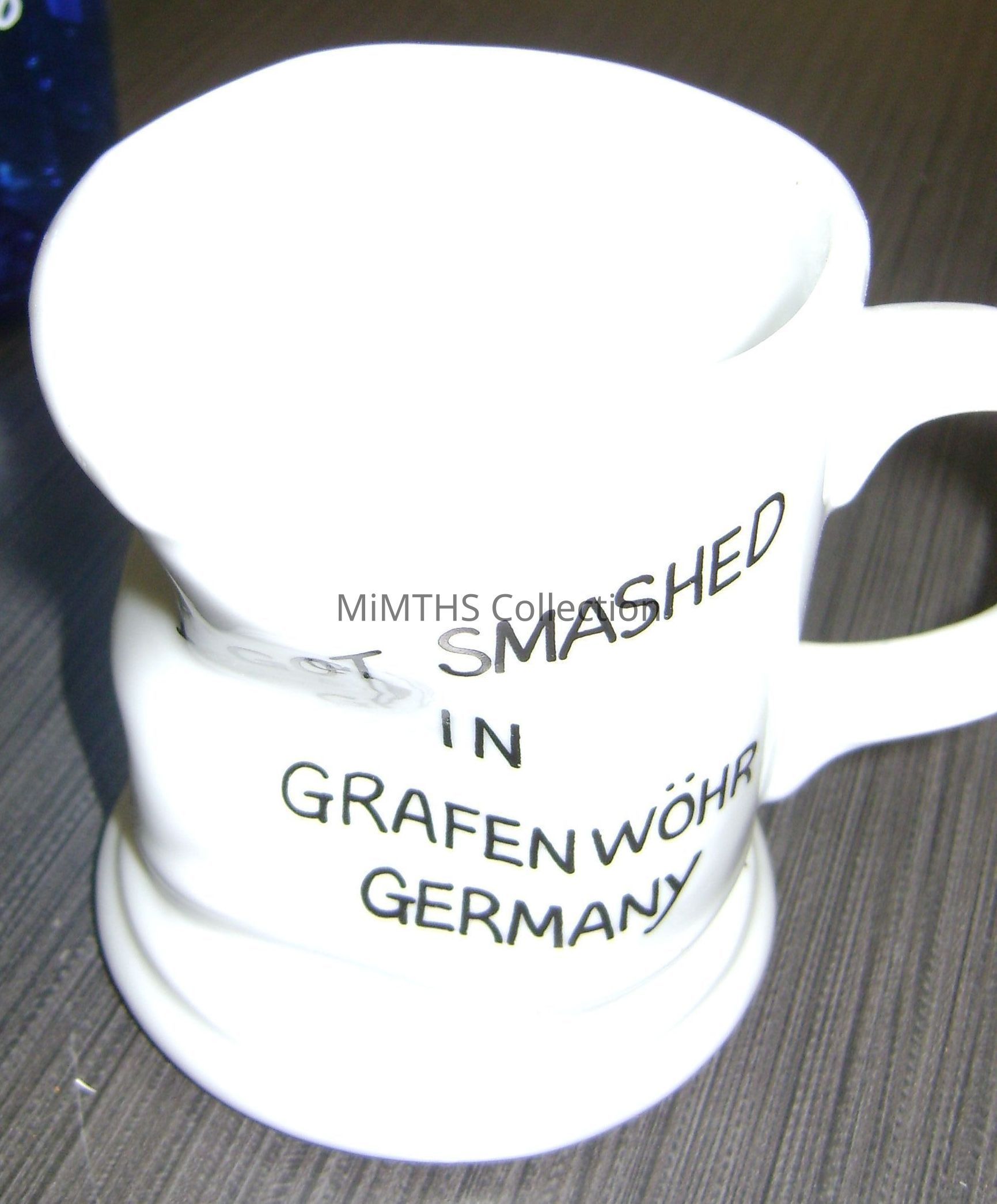 "I Got Smashed in Grafenwoehr" mug. Mug is manufactured to appear crushed or smashed.