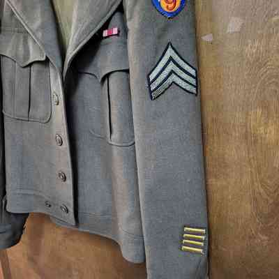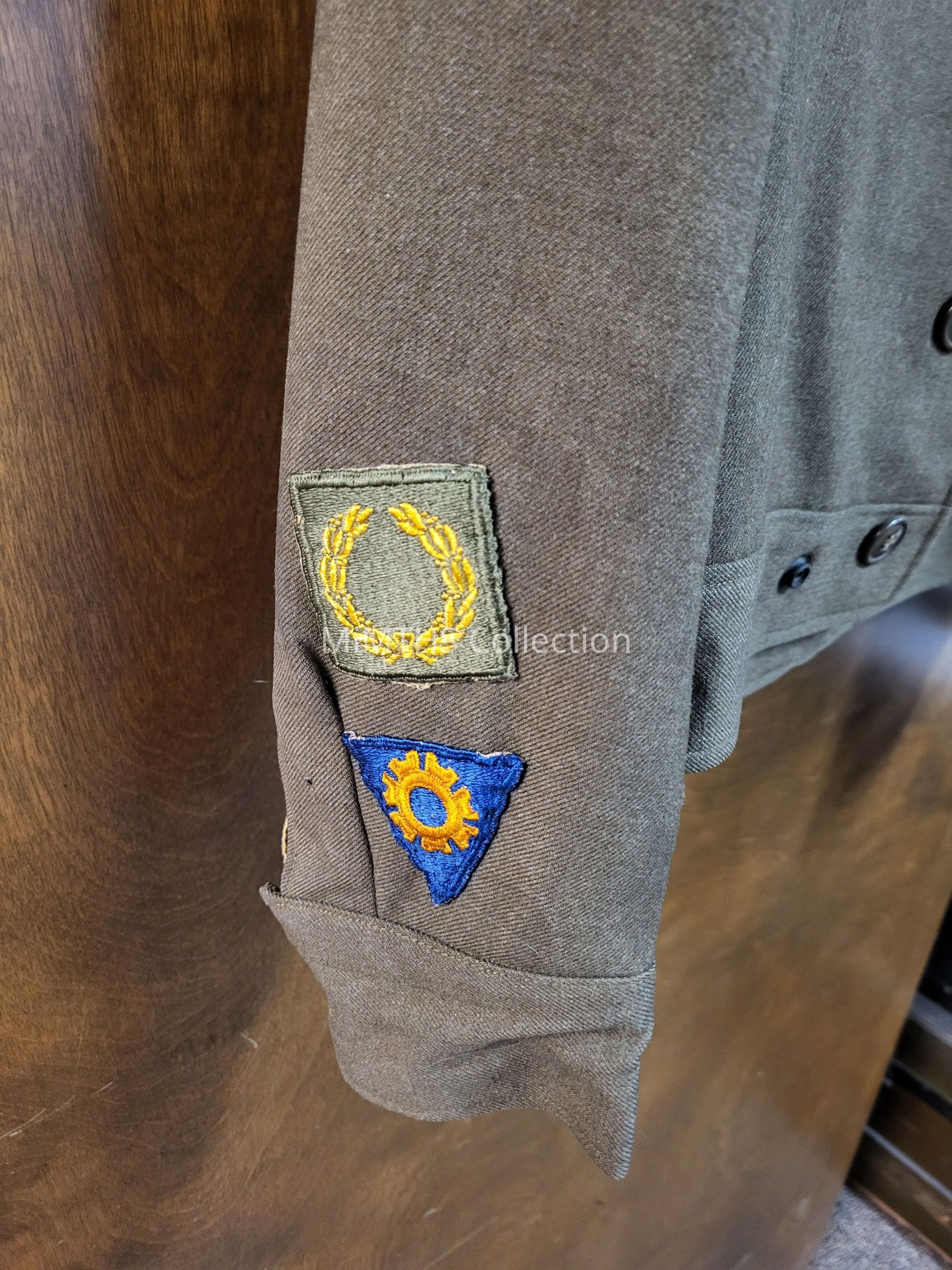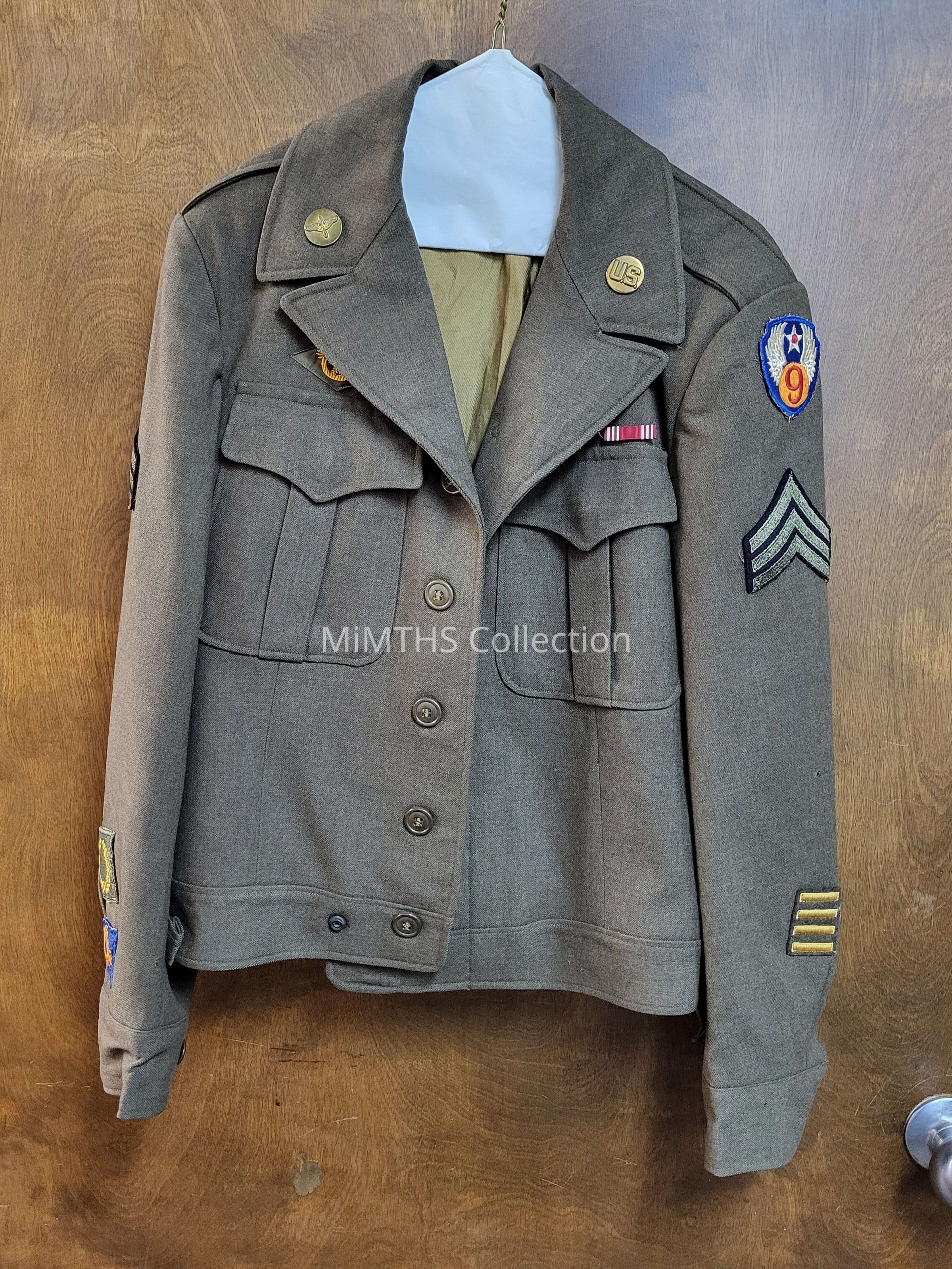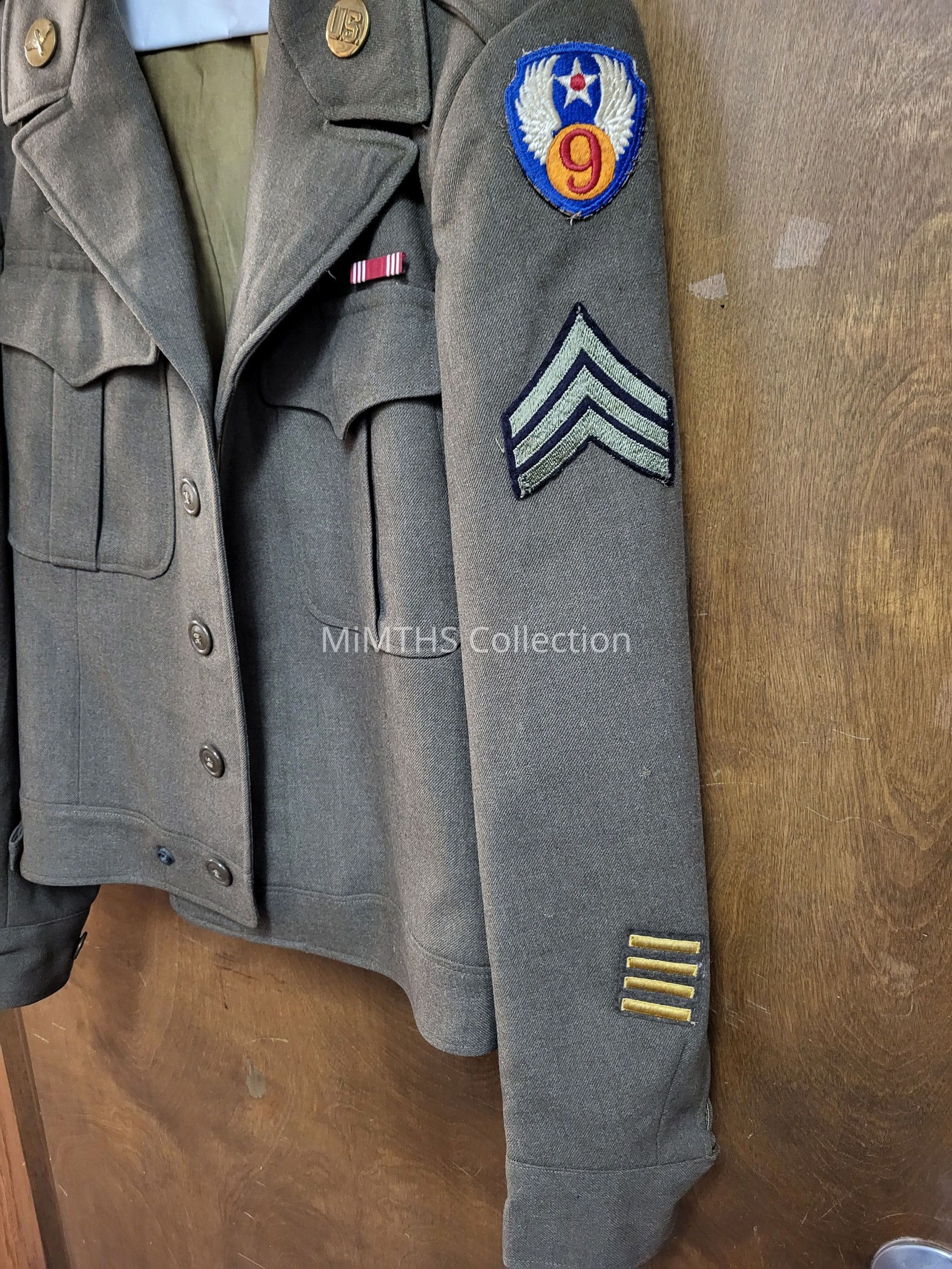 Jacket, Field, OD or "Ike Jacket" with 9th Air Force patch, Sgt Stripes, four overseas bars (2 years) Meritorious Service Unit Badge, and USAAF Engineering Specialist Patch.Cataloged By