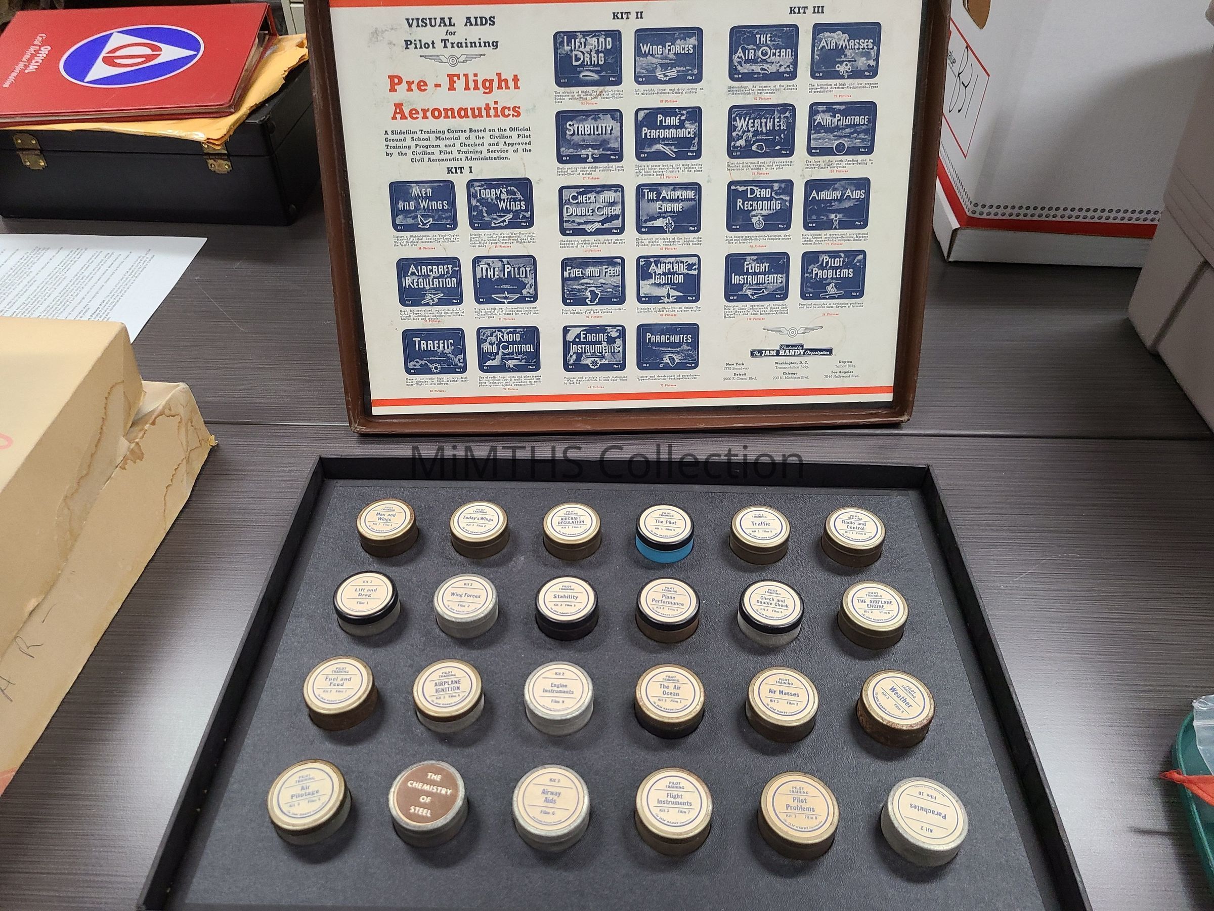 Brown case containing 24 filmstrips from the Jam Handy corporation for Pre Flight Aeronautics. There is a receipt in the box indicating these were sold to a person in Midland, Michigan in 1948.