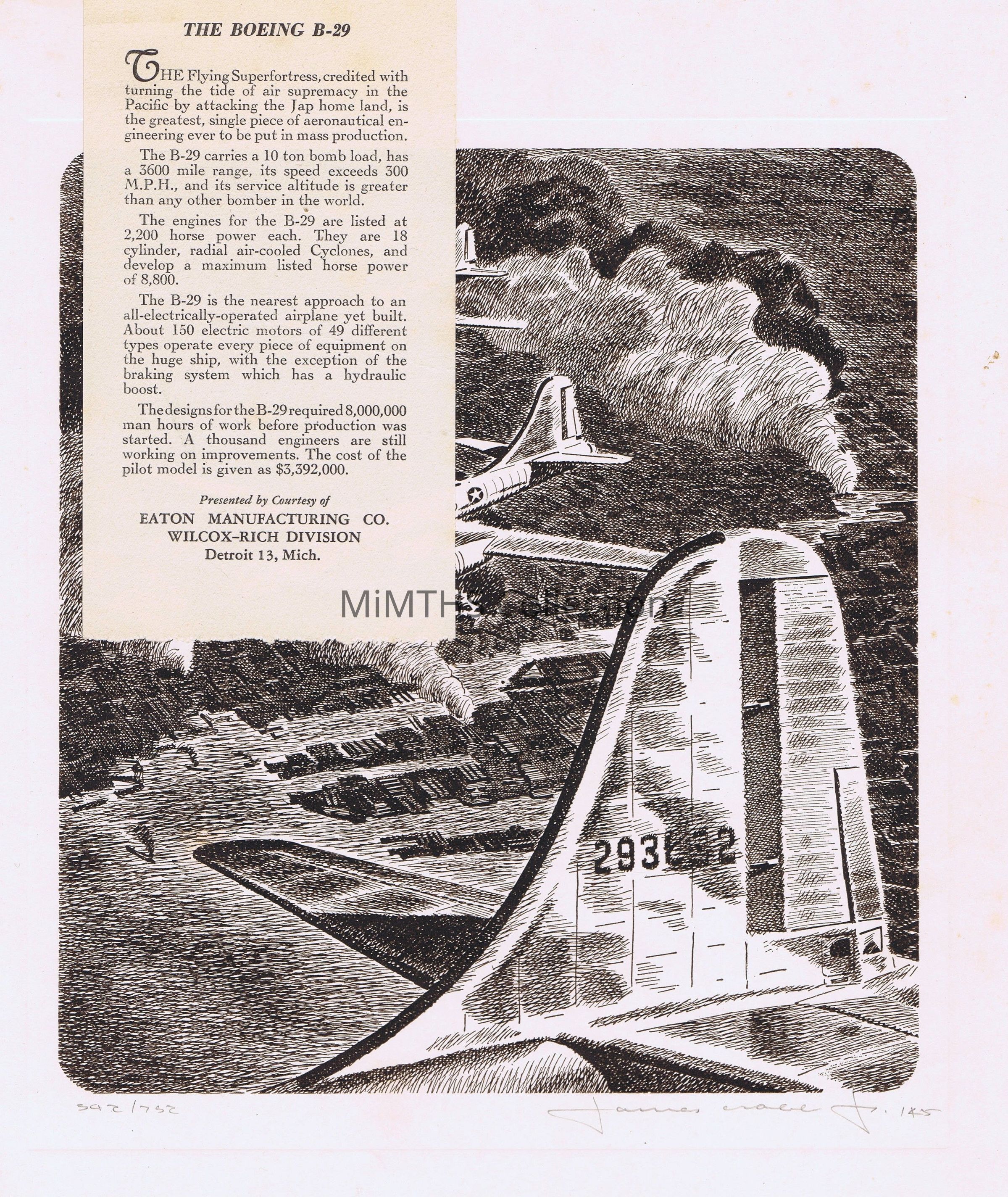 Eaton Mfg. Corp, Wilcox-Rich Division - lithographs after pen and ink drawings by James Crabb Jr, "presented by courtesy of" Eaton Mfg. Co., Detroit, MI; 1943-1946. Signed, dated and numbered in pencil. image has a descriptive tag that folds over sheet. Part of a larger set of lithographs from WWII.Cataloged By