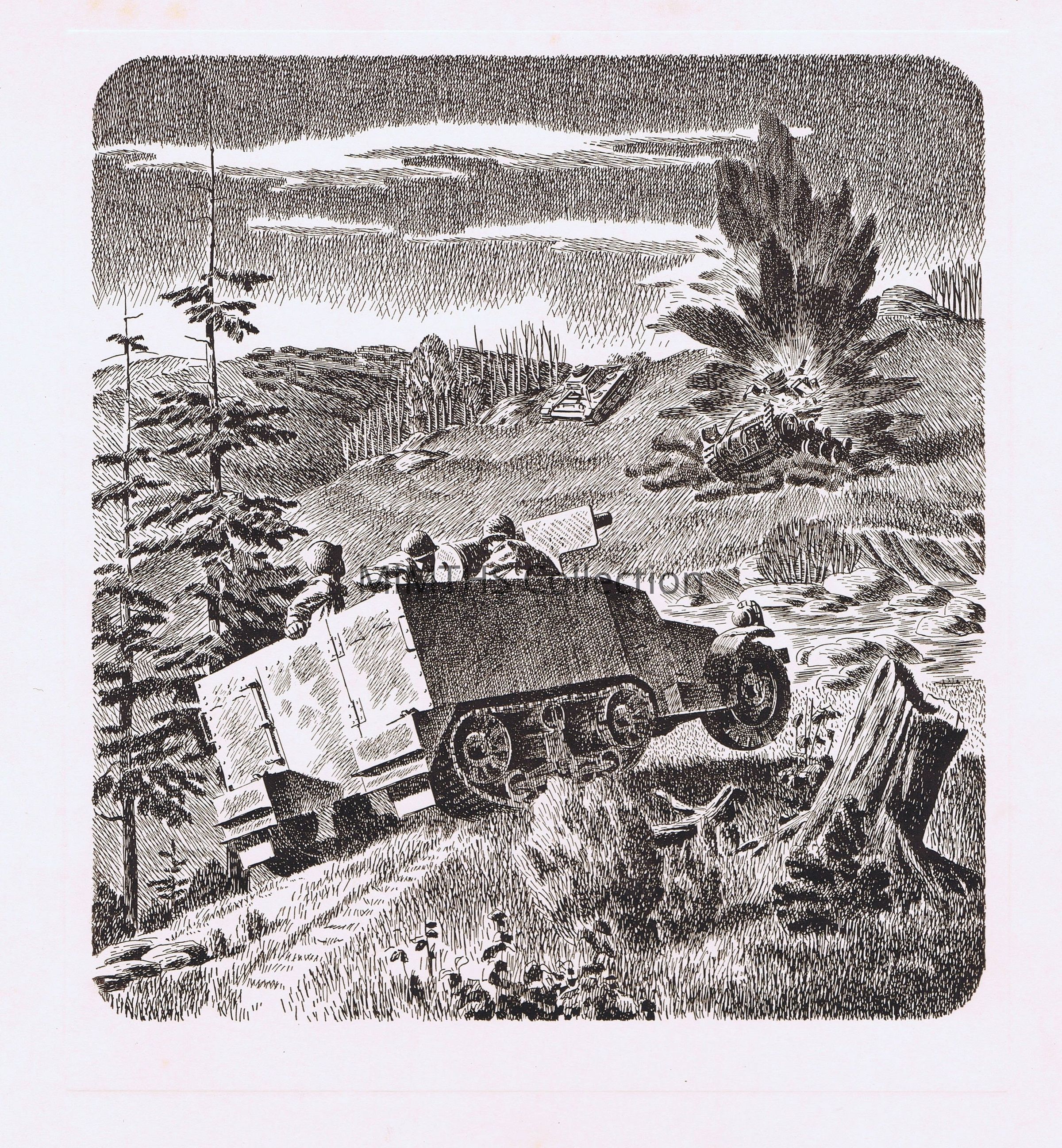 Eaton Mfg. Corp, Wilcox-Rich Division - lithographs after pen and ink drawings by James Crabb Jr, "presented by courtesy of" Eaton Mfg. Co., Detroit, MI; 1943-1946. image missing descriptive tag that folds over sheet. Part of a larger set of lithographs from WWII.Cataloged By