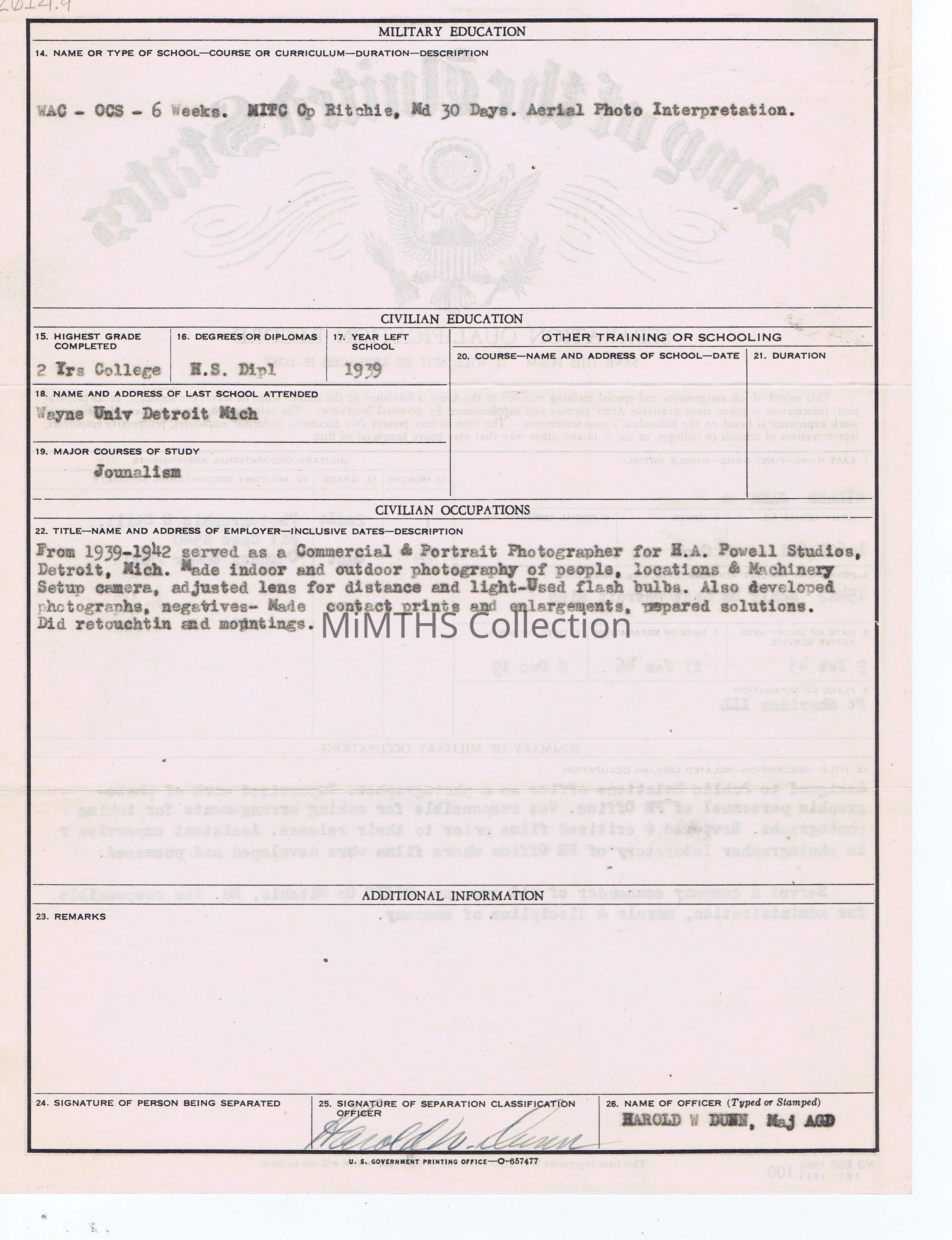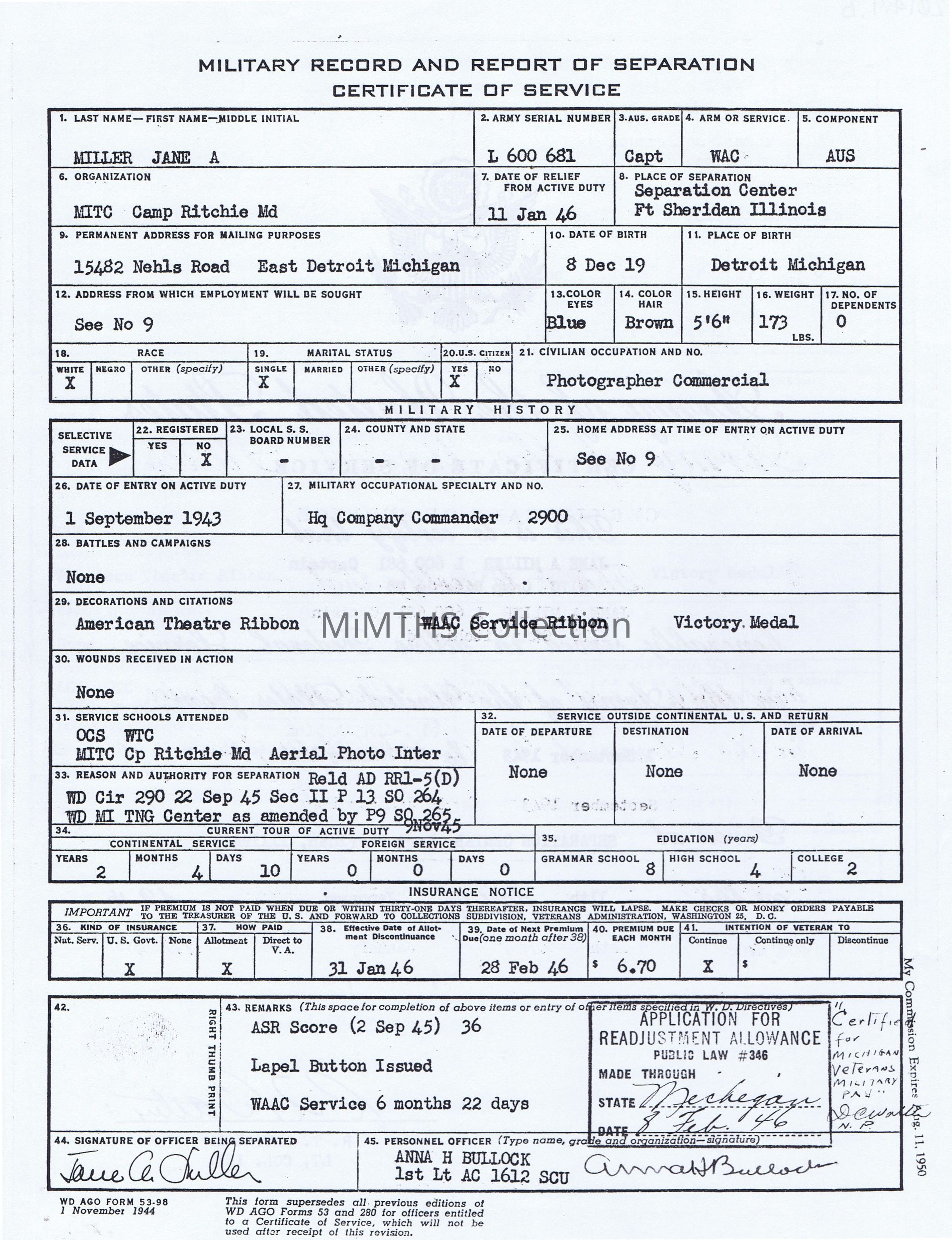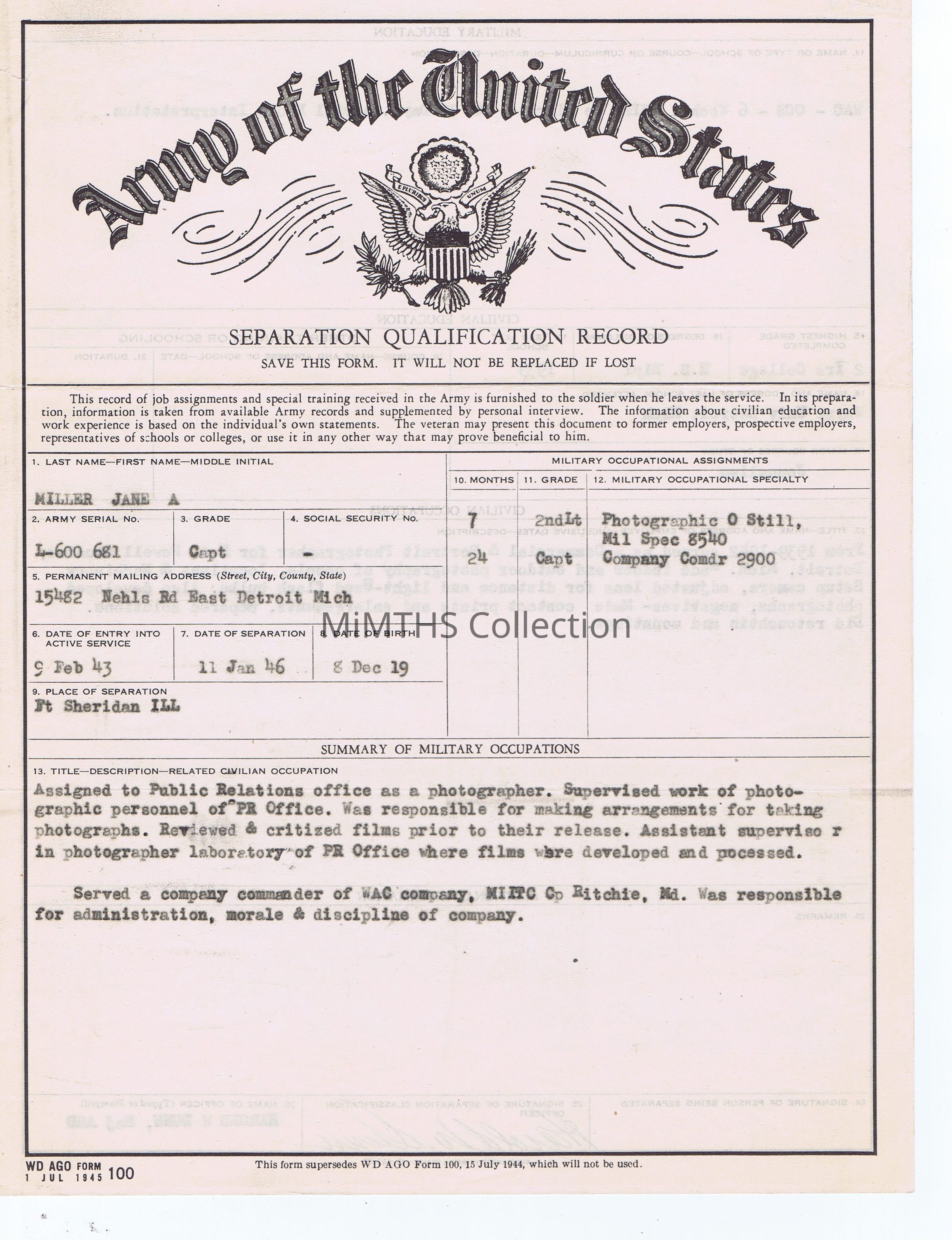 Jane Miller was an East Detroit resident who attained the rank of Captain in WWII serving as a photographic interpreter.