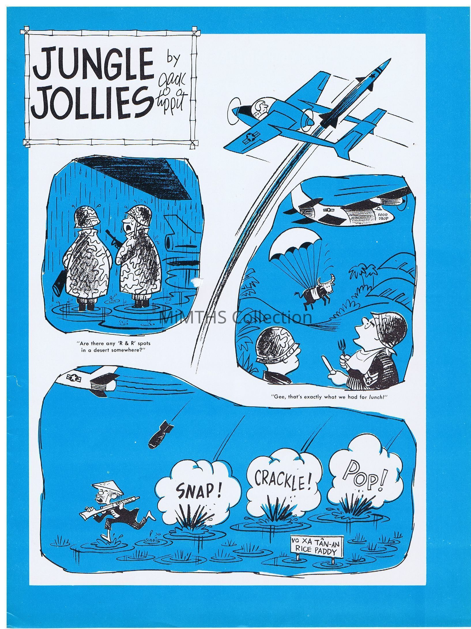 Three Jungle Jollies cartoons by Jack Tippit, from Vietnam Era printed on page from magazine.