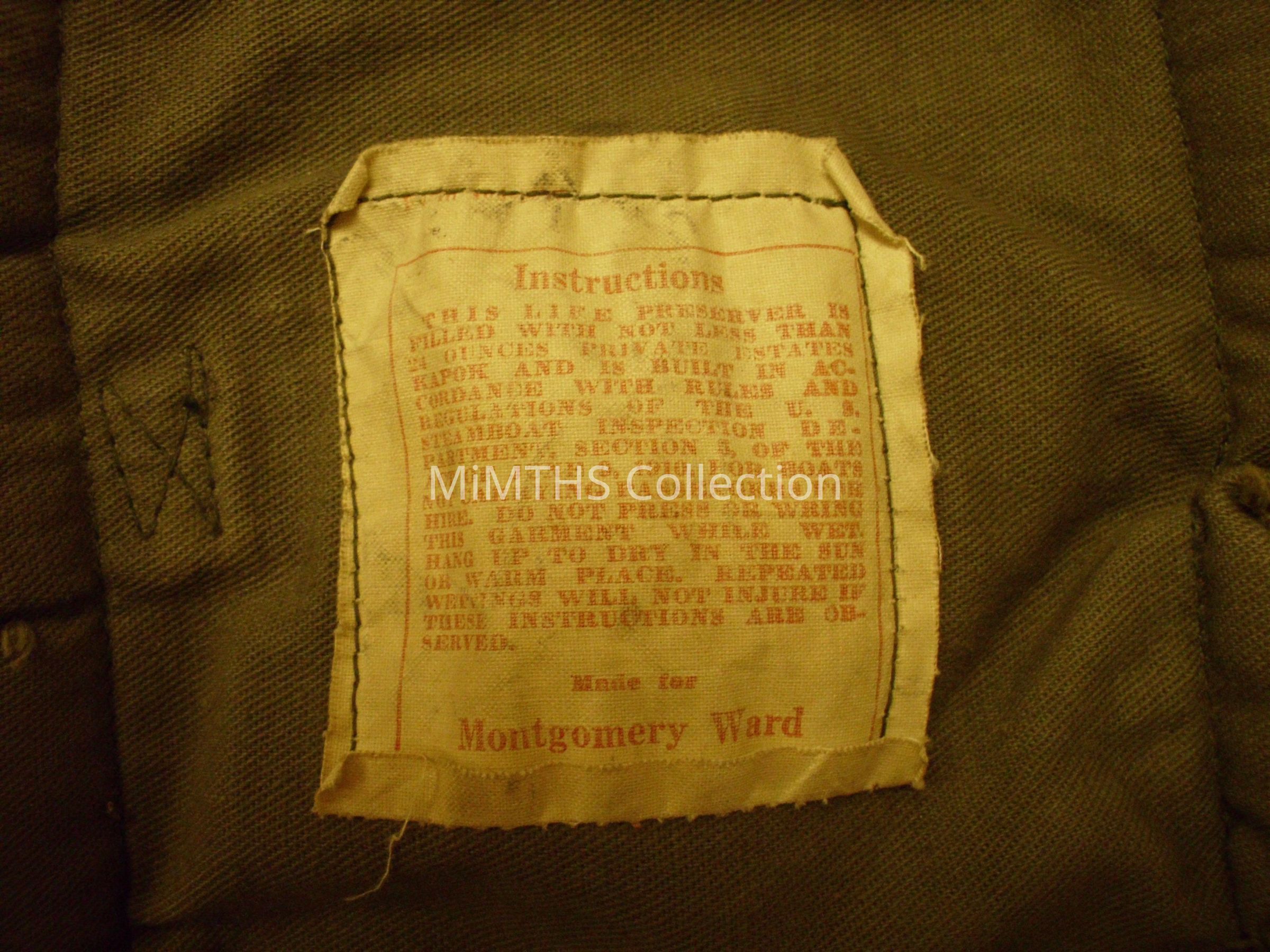 Kapok filled life jacket made by Montgomery Ward, Chicago Ill. Has USMC EGA markings on front and back, no date.Cataloged By