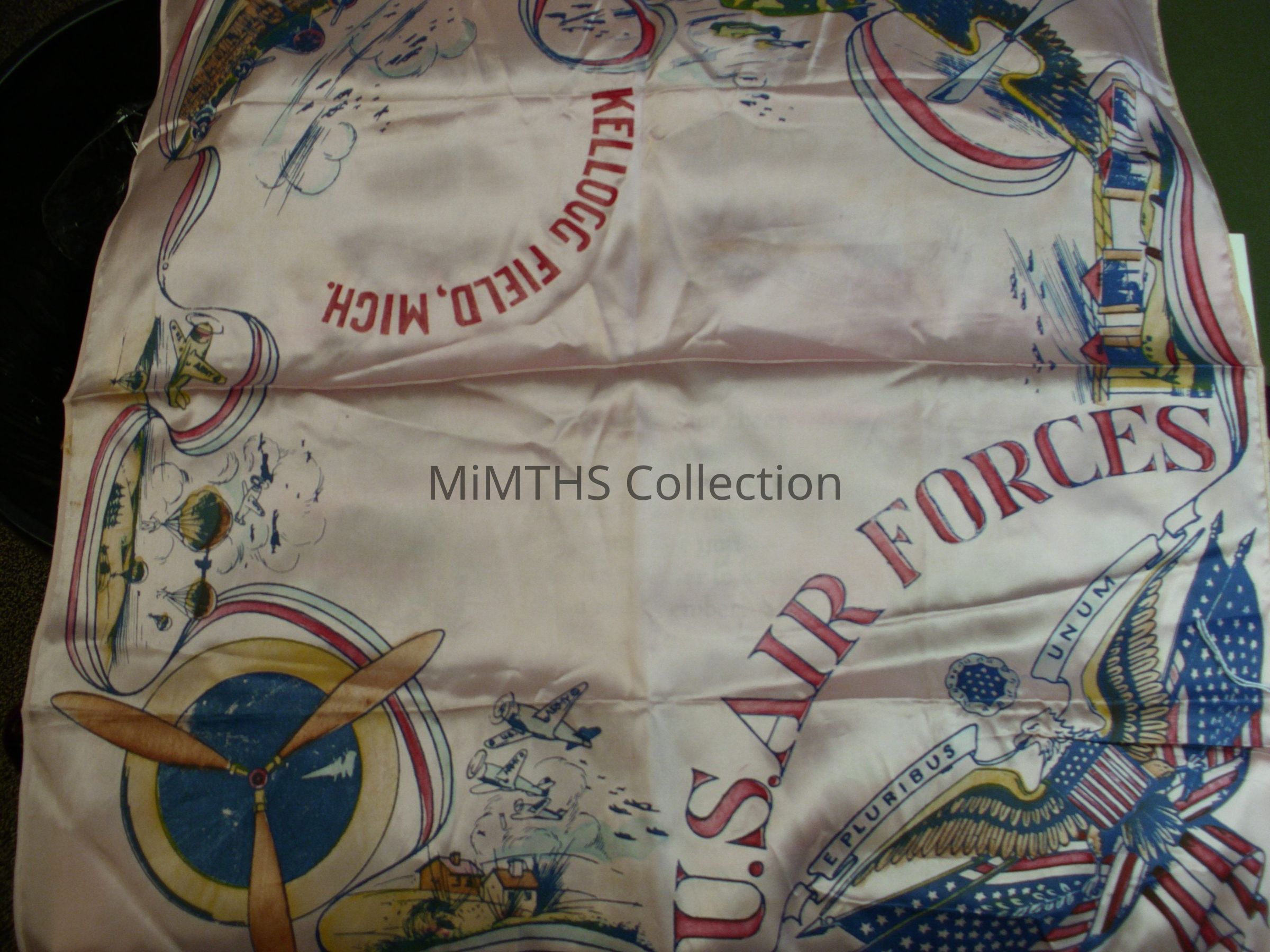 22" Square pink satin table sham from Kellogg Field, Mich. All graphics screened on except the "Kellogg Field, Mich" which is a heat transfer.Cataloged By