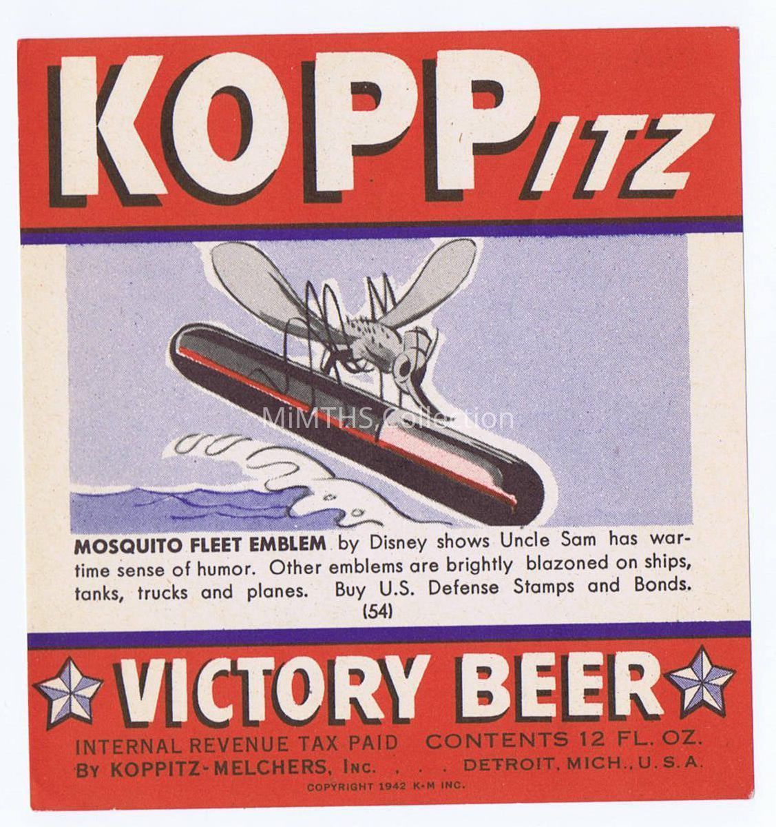 Koppitz Victory Beer label # 54 in the series, features the Disney designed Mosquito Fleet Emblem (PT Boats)Cataloged By