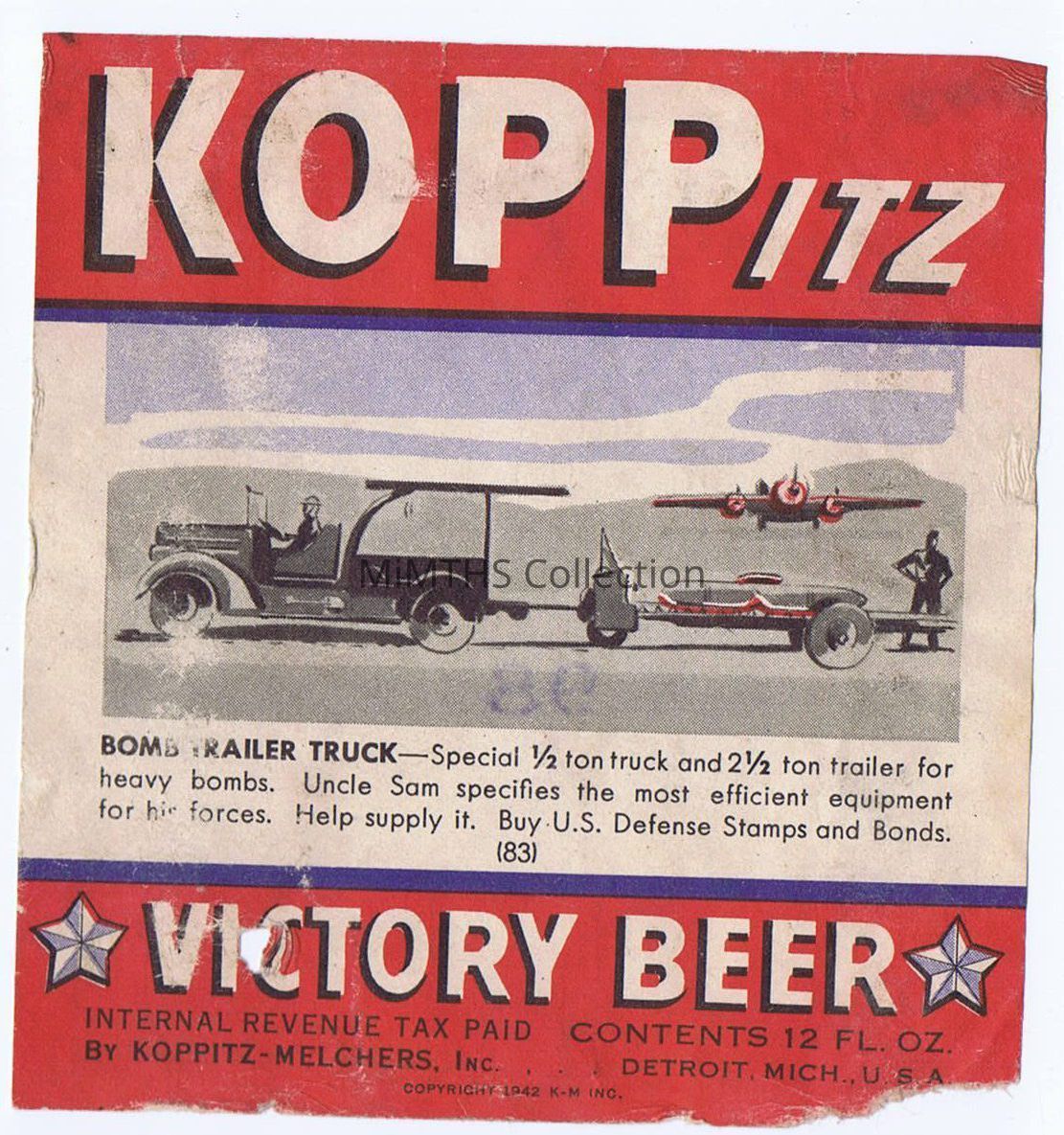 3.5x3.75 inch paper label from a Koppitz Melchers beer, number 83 featuring an M5 Bomb Trailer and M6 Bomb truckCataloged By