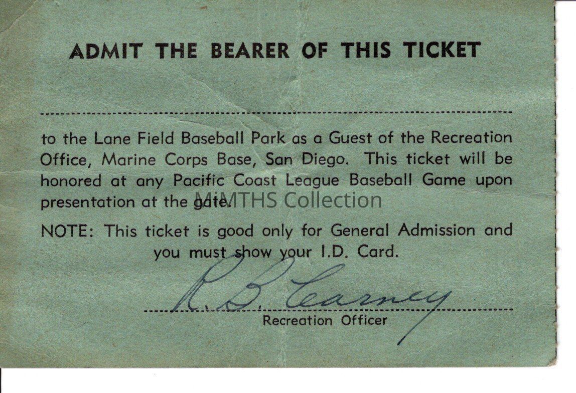 Recreation Office, Marine Corps Base San Diego free pass to a Pacific Coast Baseball game at Lane Field, San Diego.