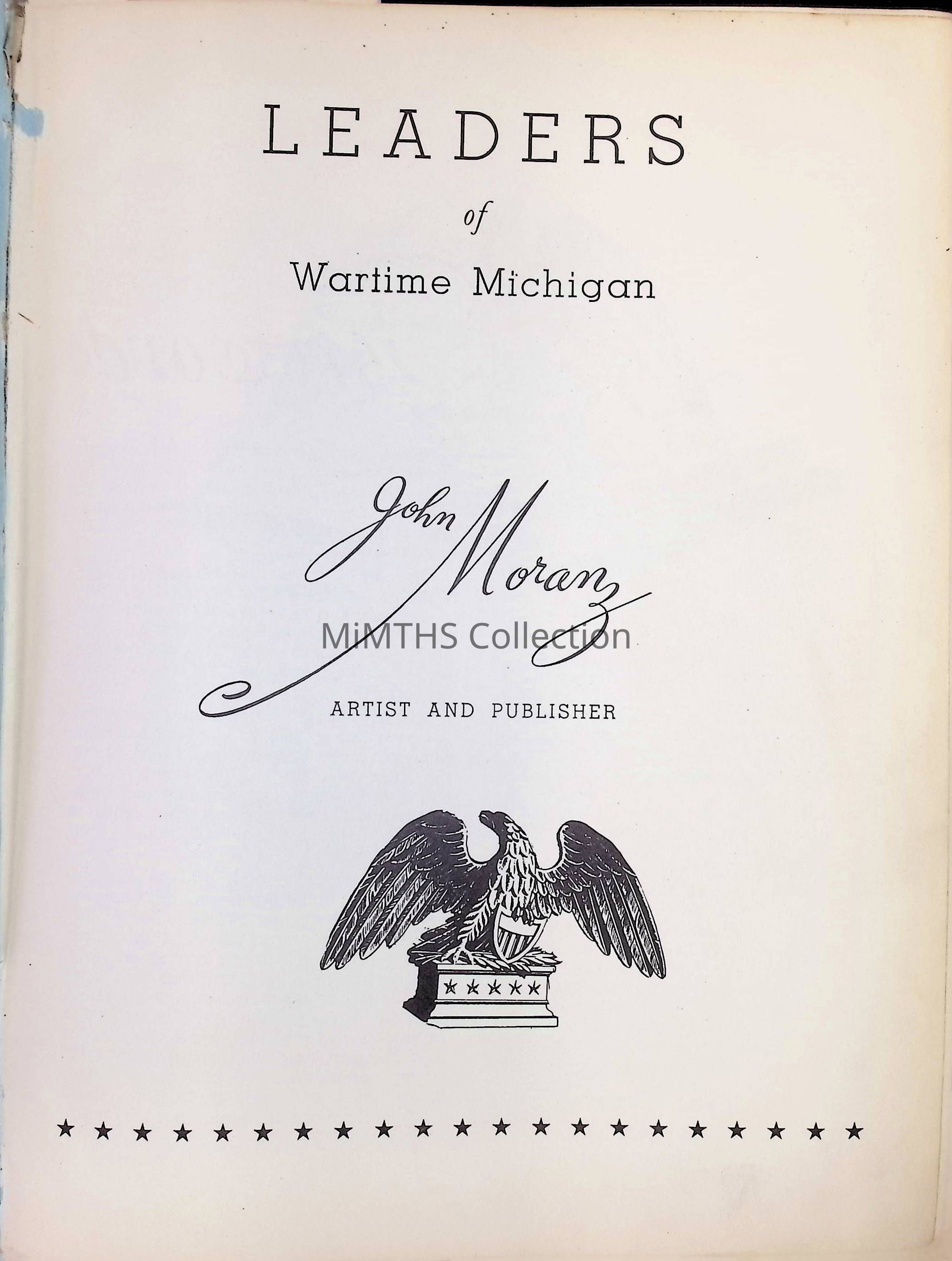 Leaders of Wartime Michigan (1945), authored and illustrated by John Moranz, is a 295-page book documenting prominent Michigan figures during World War II, focusing on their roles in the "Arsenal of Democracy". The book highlights political, industrial, and military leaders who led the state's war effort.Cataloged By