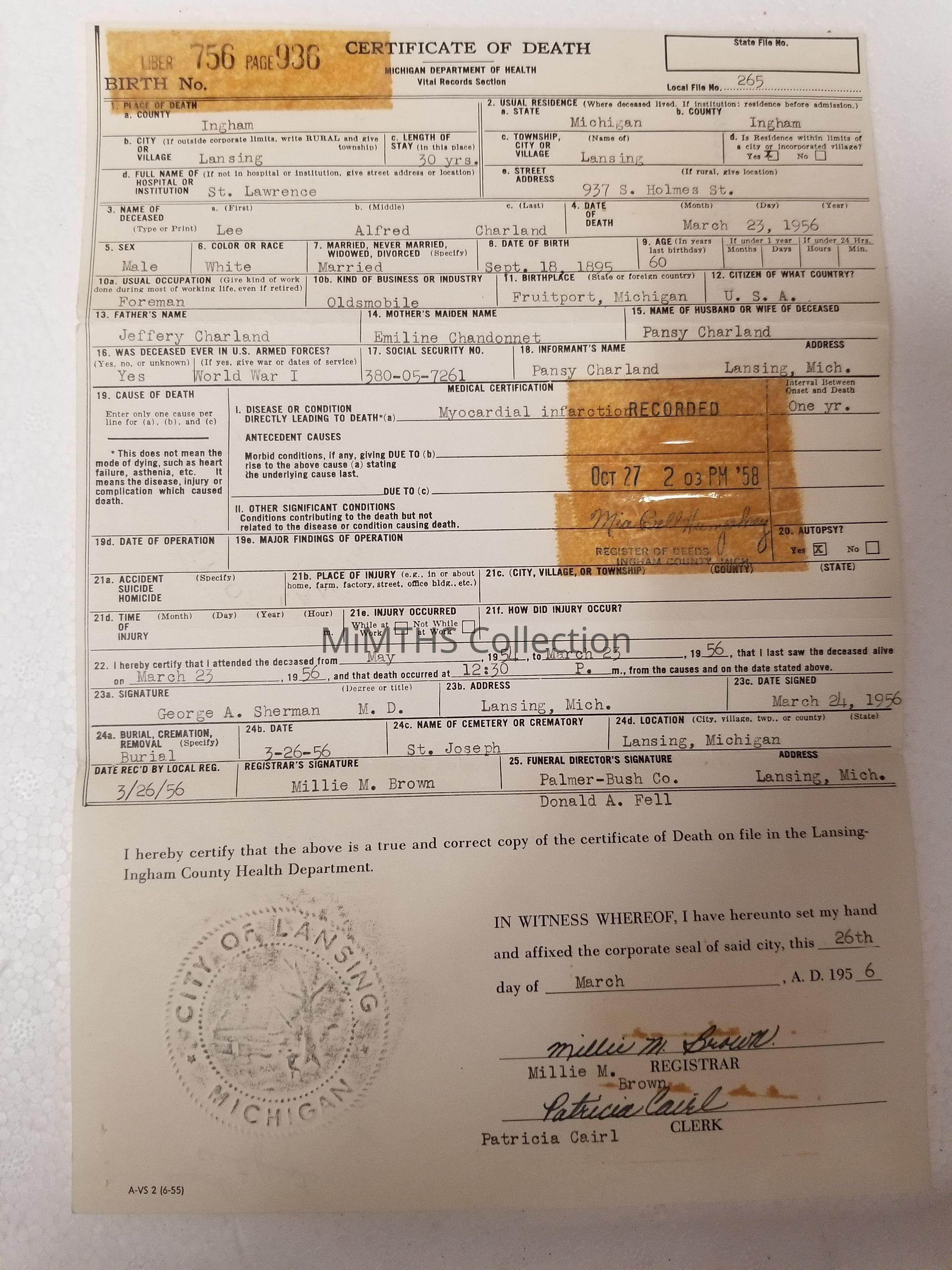 Death Certificate for Lee A. Charland 1896--1956 US Arm WWI.Cataloged By