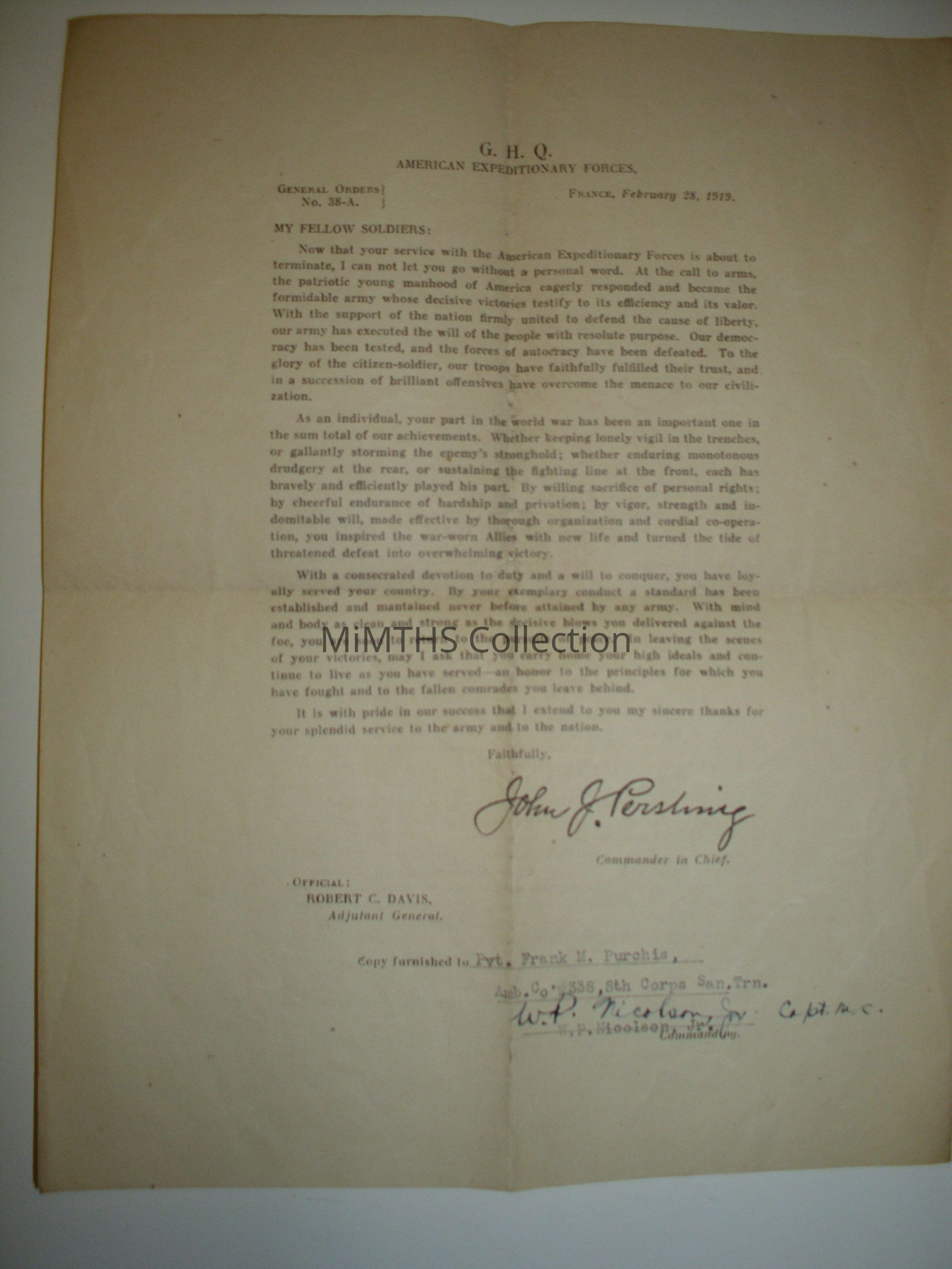 France, Feb 28, 1919. letter from Gen Pershing to troops saying the war is overCataloged By