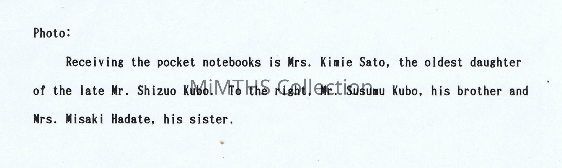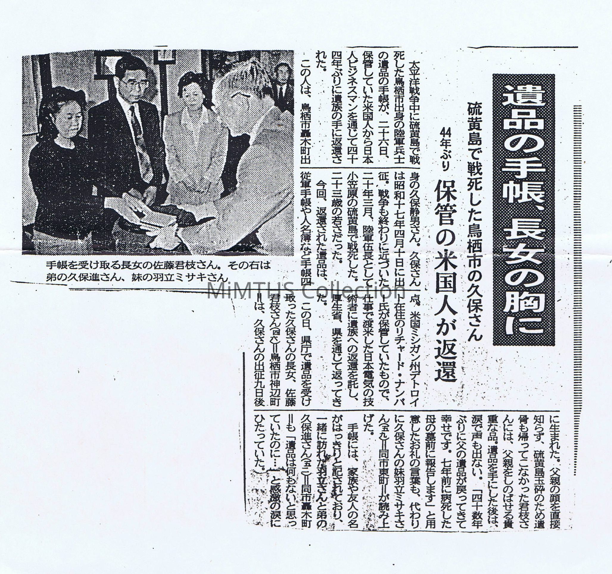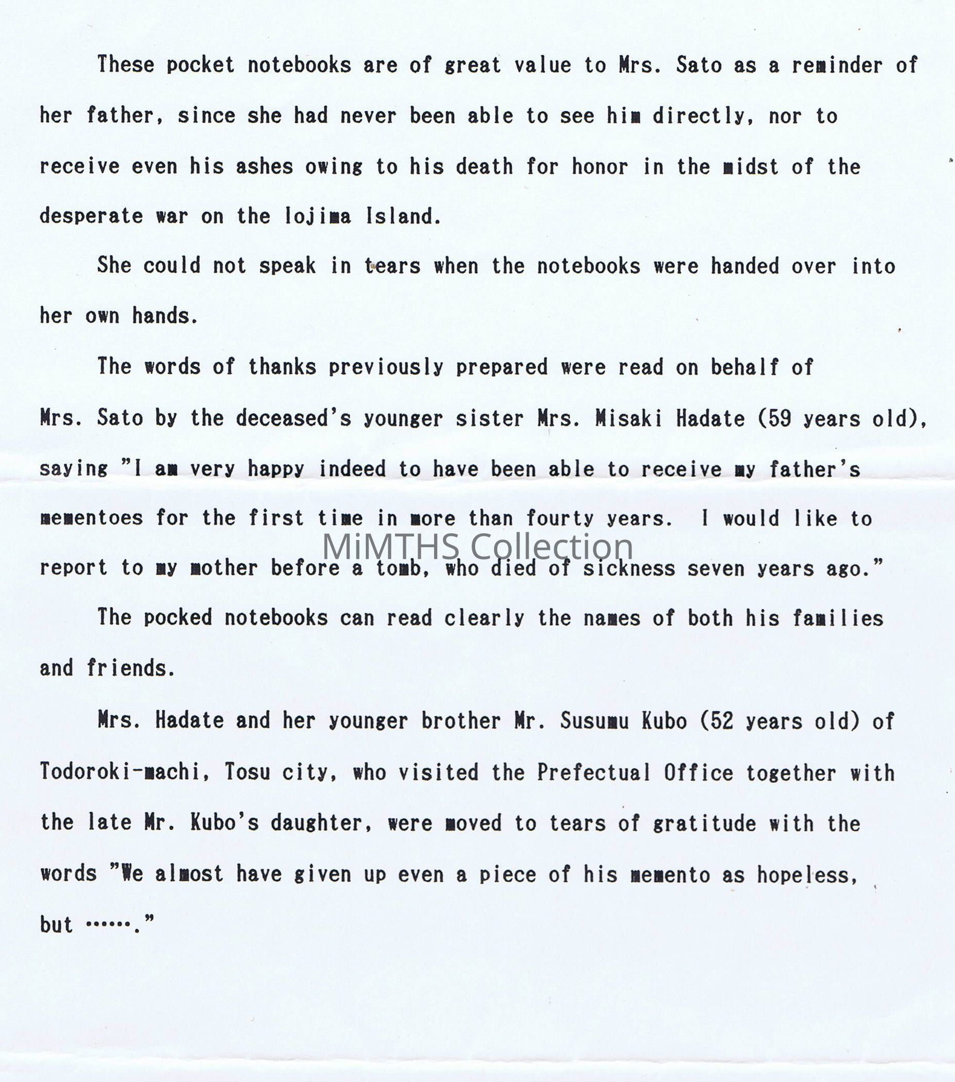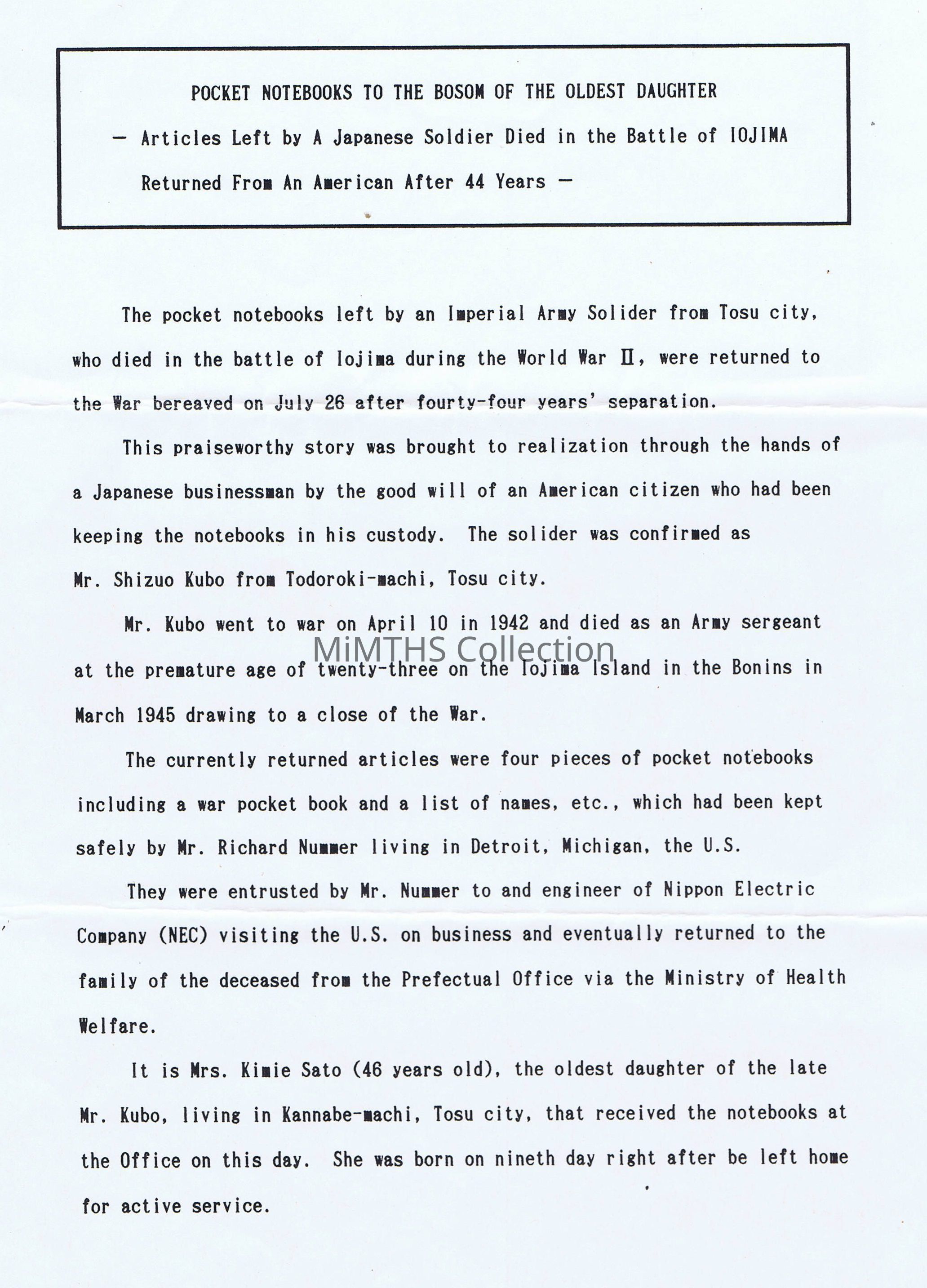 6pg letter from Japanese Min. of Health and Welfare regarding items Marine Richard Nummer returned to the families of deceased Japanese soldiers 44 years after Iwo Jima. Includes a translated news article about the returnAcquisition