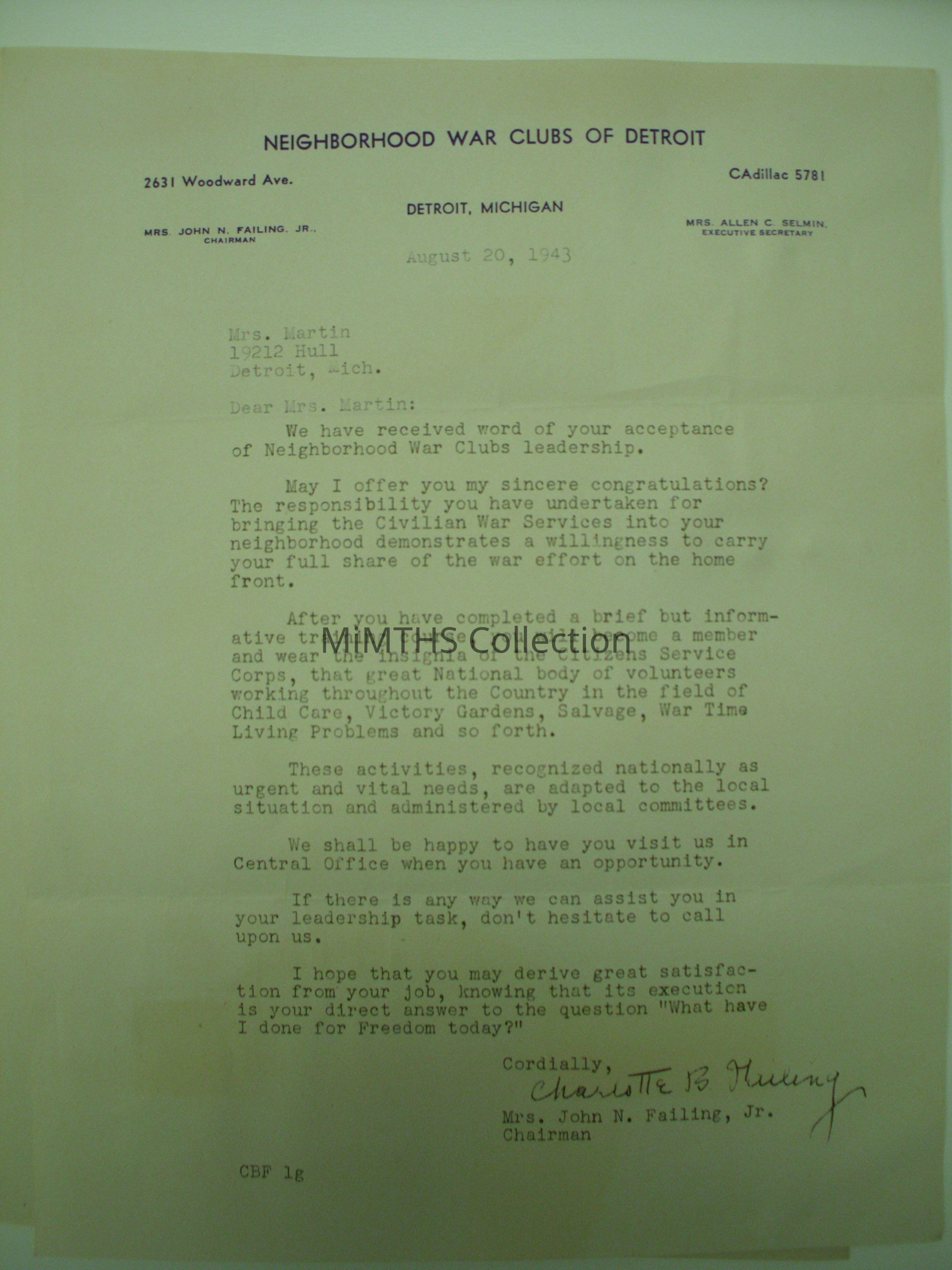 Letter dated 8-20-1943 stating Mrs Martins acceptance as Block leader