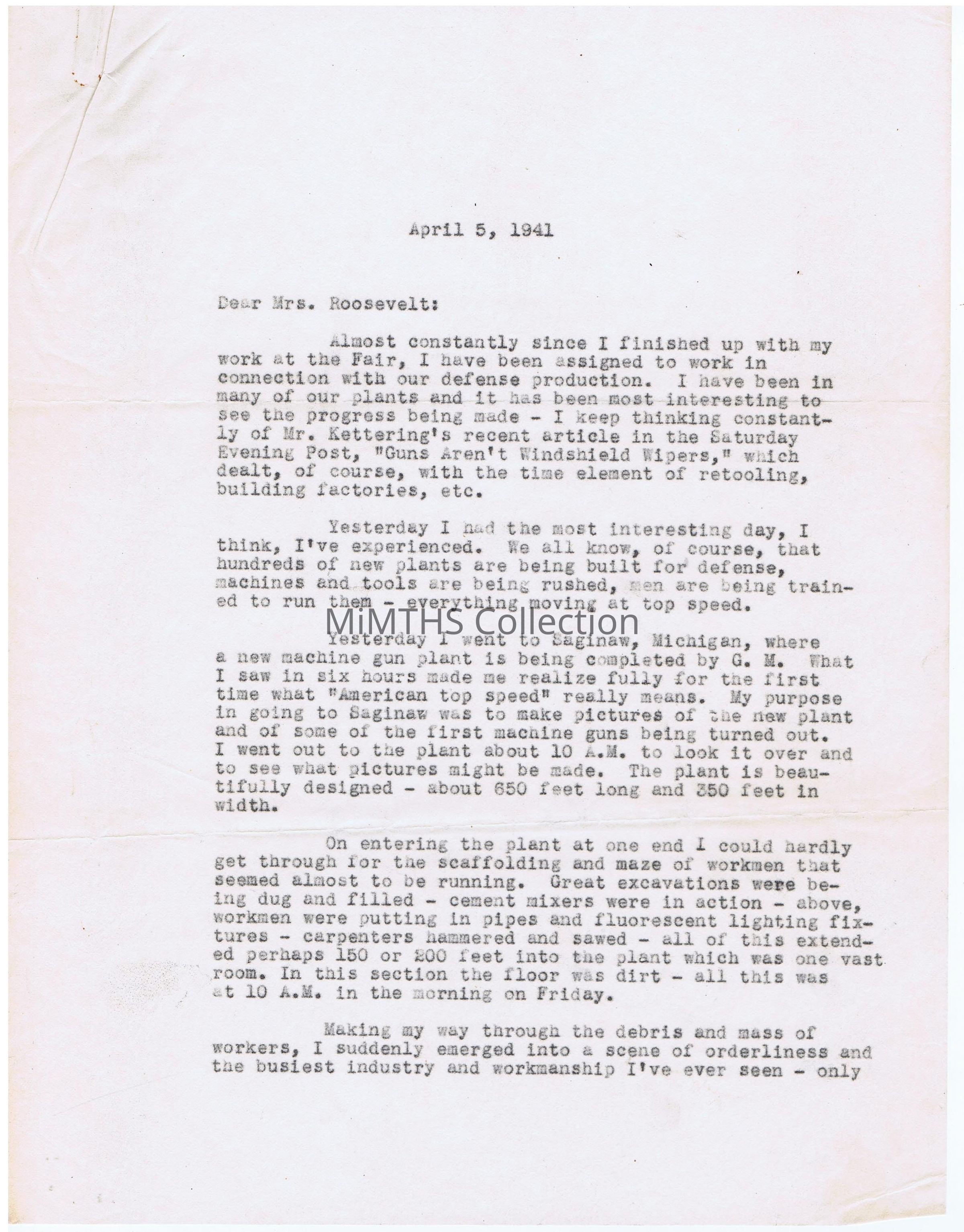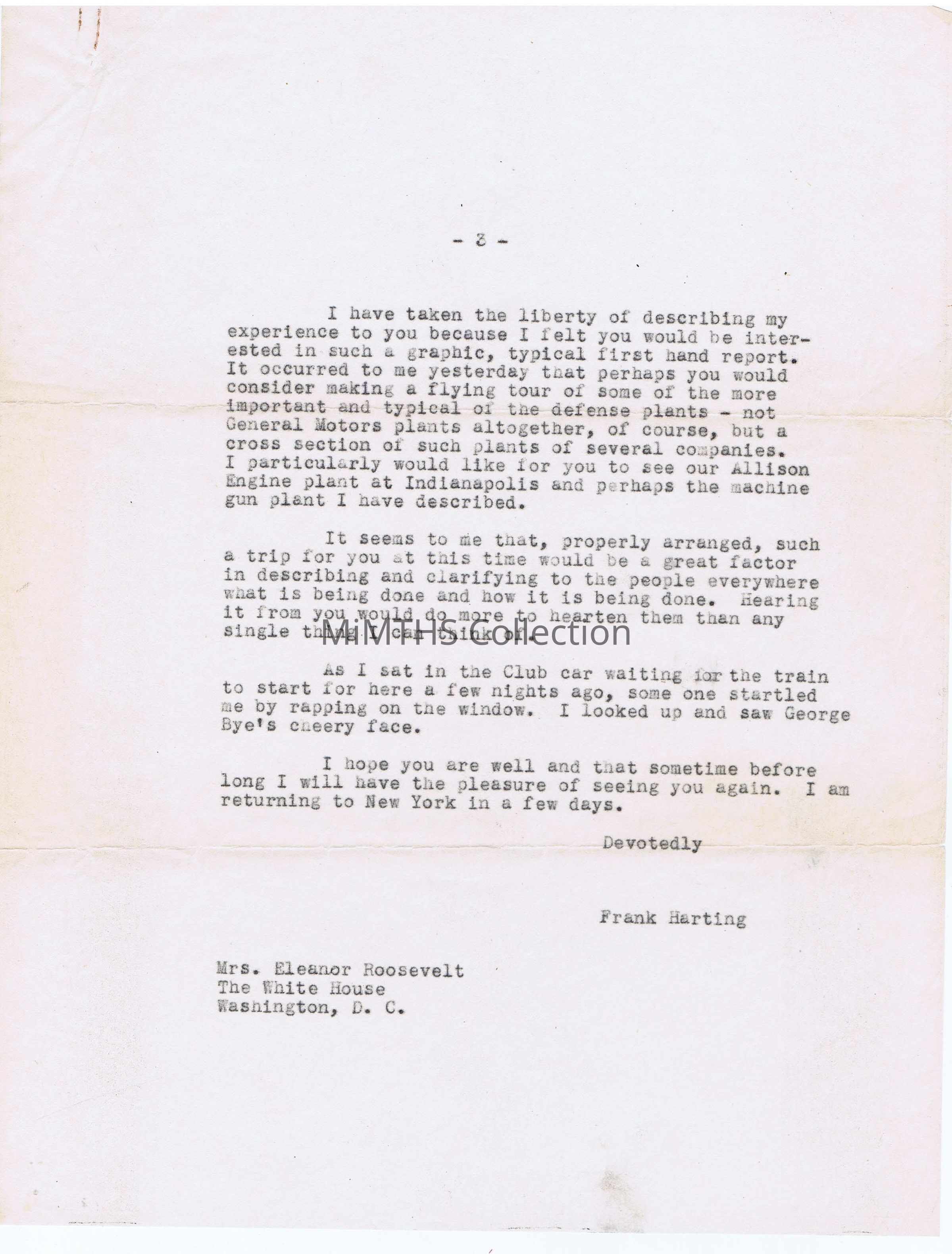 3 page letter on vellum from Frank Harting to Elenor Roosevelt describing his visit to the GM Saginaw Gun Plant, under construction.Cataloged By