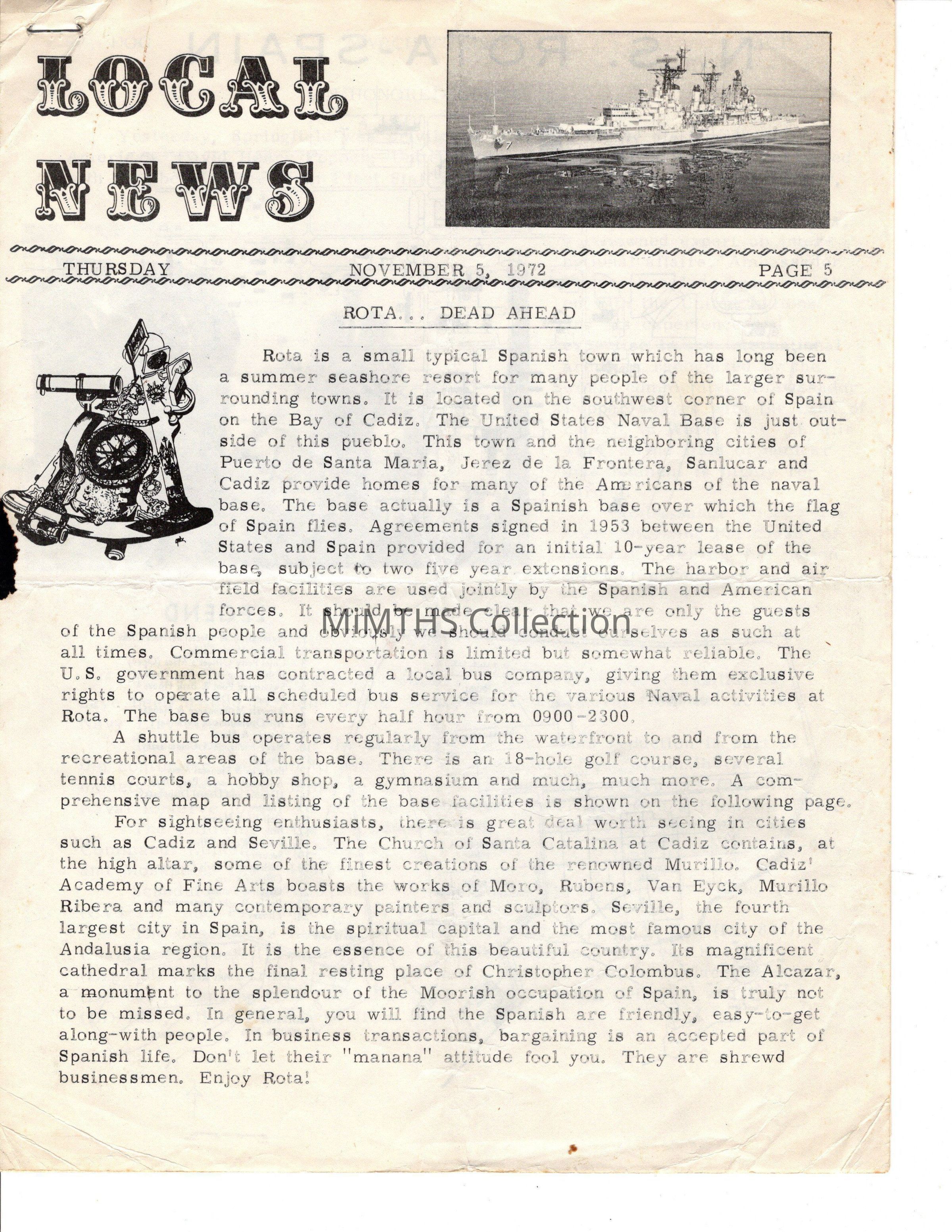 Newsletter from the USS Little Rock. Arrival in Rota, Spain. November 1972Cataloged By