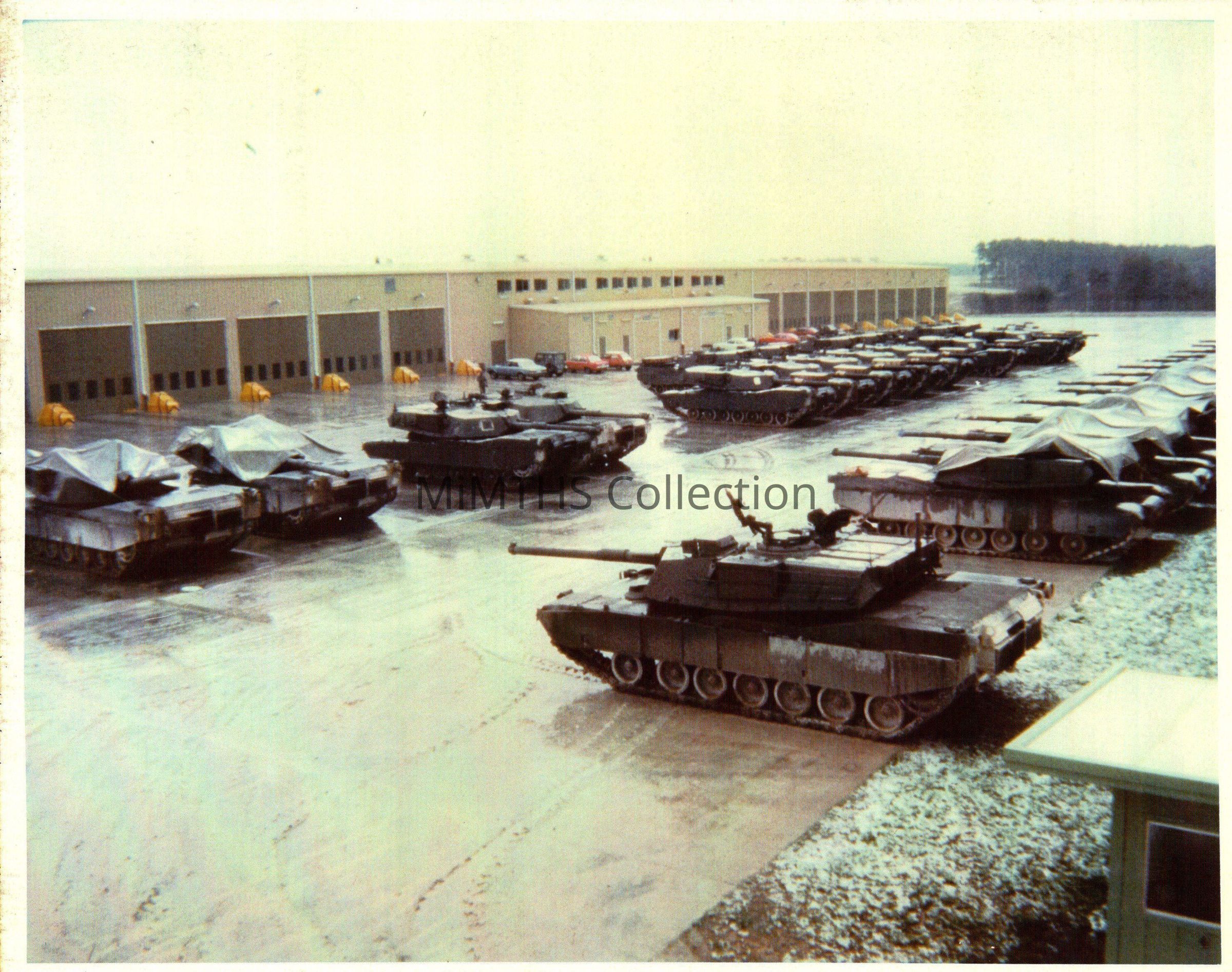 Photo of M1 Abrams tanks in a motor pool with snow on the ground. Based on the vehicles in the background, this picture was taken in Europe. Possibly "The Hill" at Rose Barracks in Vilseck Germany where the Abrams MFT was located.Cataloged By