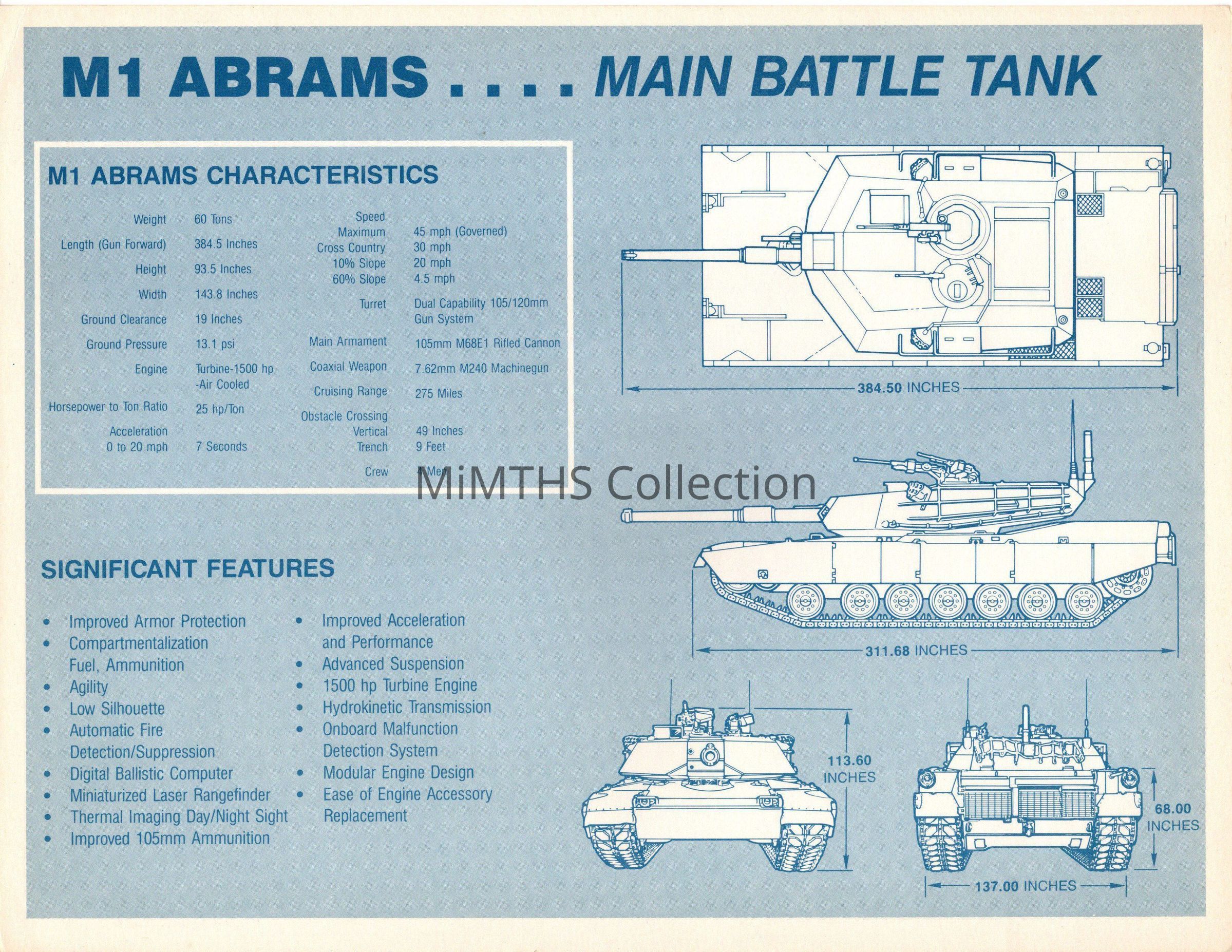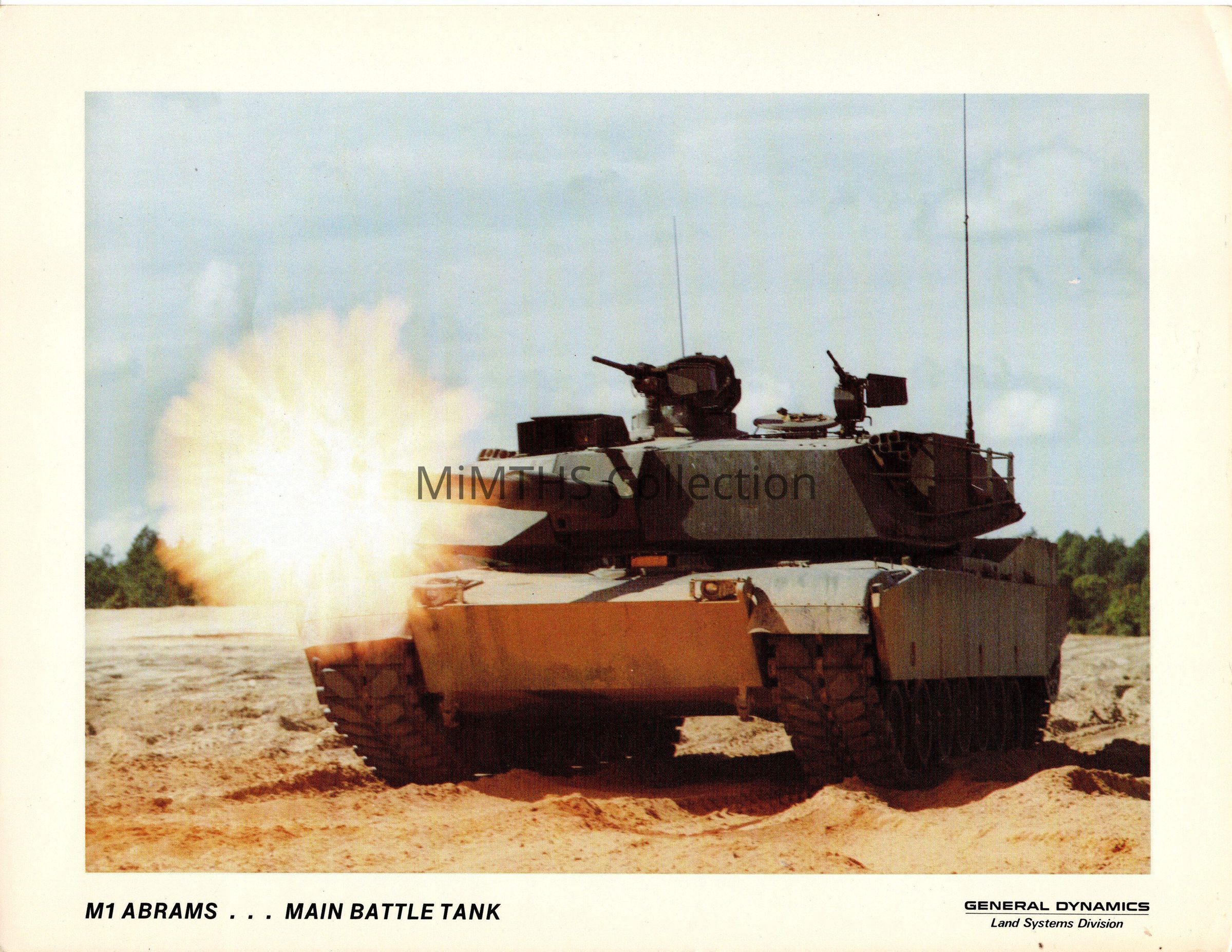 Publicity card for the M1 Abrams Tank printed by General Dynamics. These were handed out at trade shows, air shows and open house events. This one features the M1 "basic" and dates from the mid 1980's.Photograph Details
