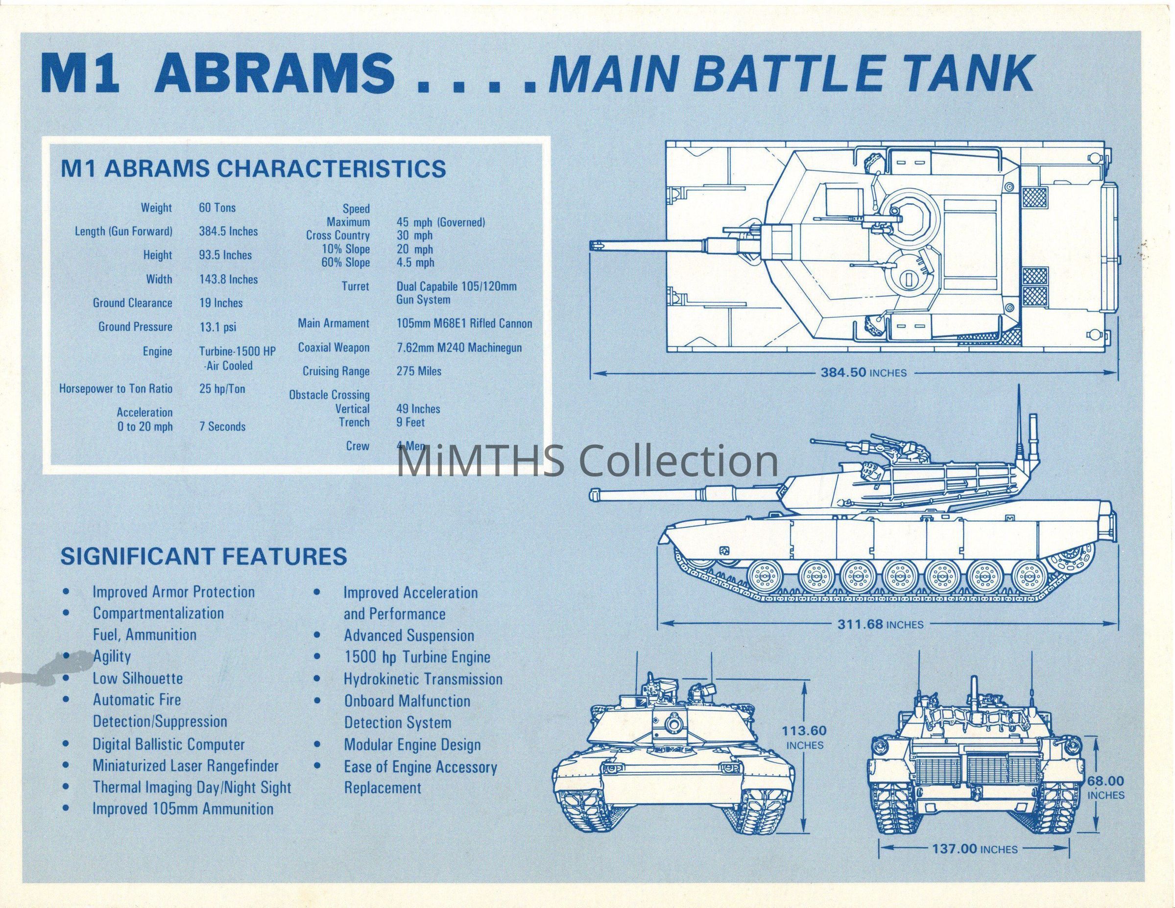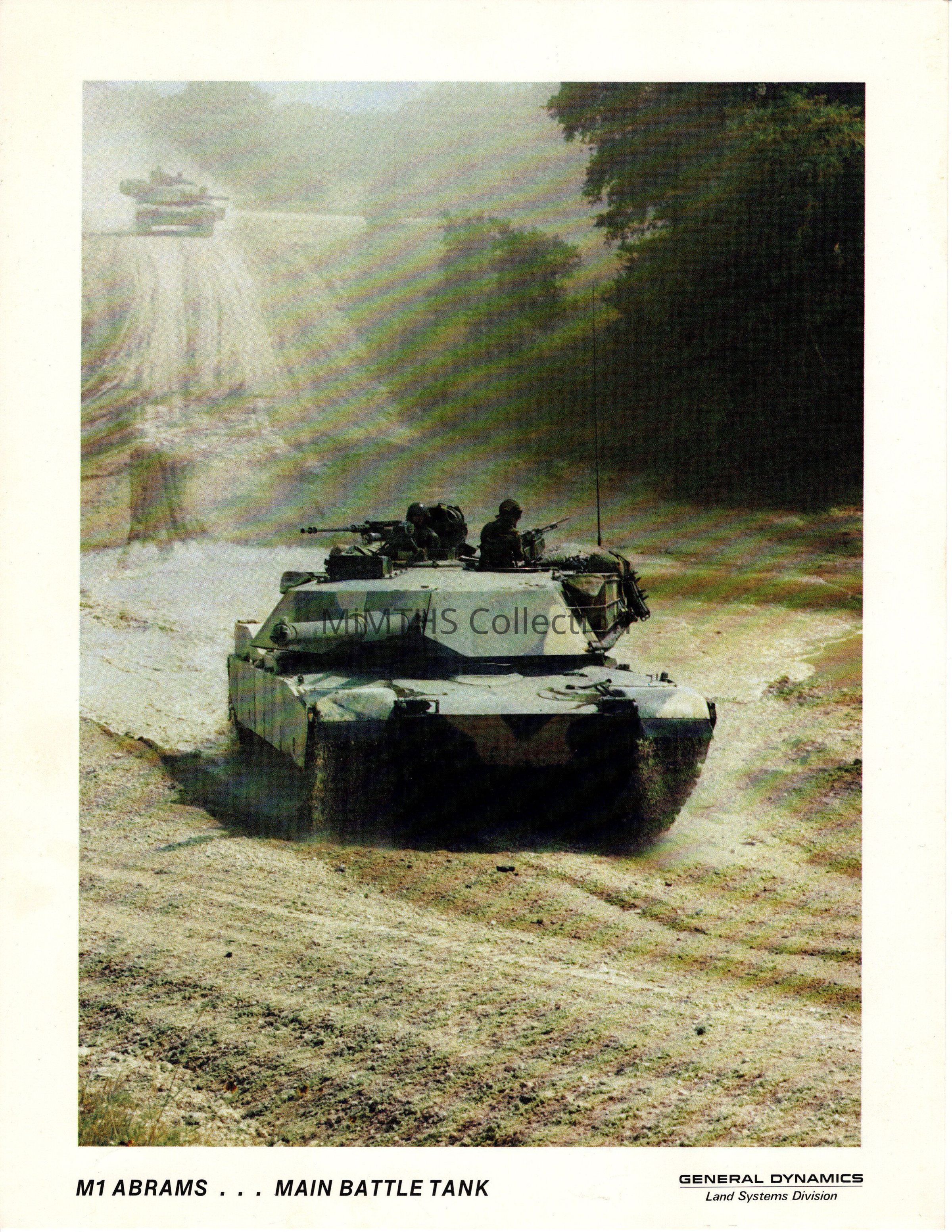 Publicity card for the M1 Abrams Tank printed by General Dynamics. These were handed out at trade shows, air shows and open house events. This one features the M1 "basic" and dates from the mid 1980's.