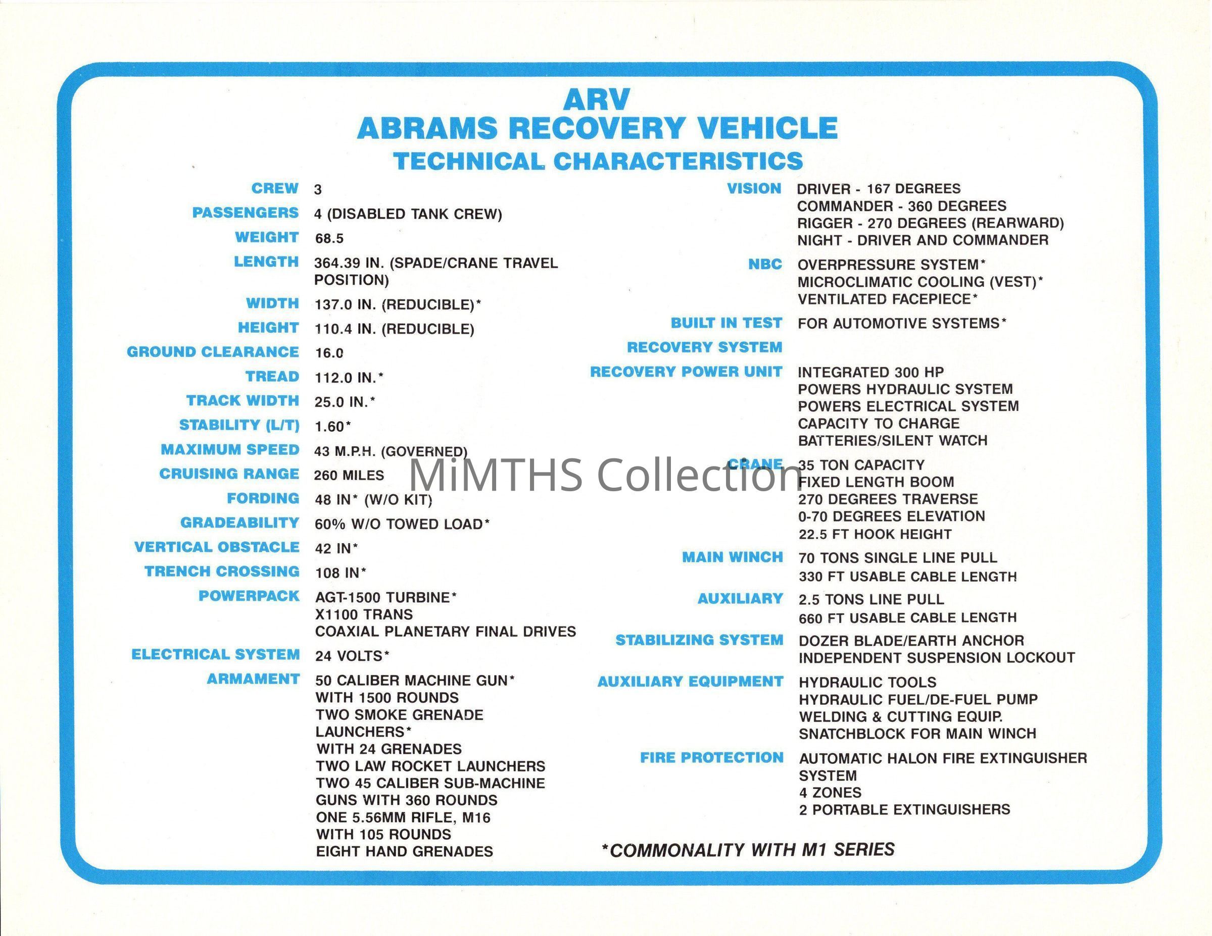 Publicity card for the M1 Abrams based Recovery Vehicle printed by General Dynamics. These were handed out at trade shows, air shows and open house events. This one features the M1 "basic" and dates from the mid 1990's.