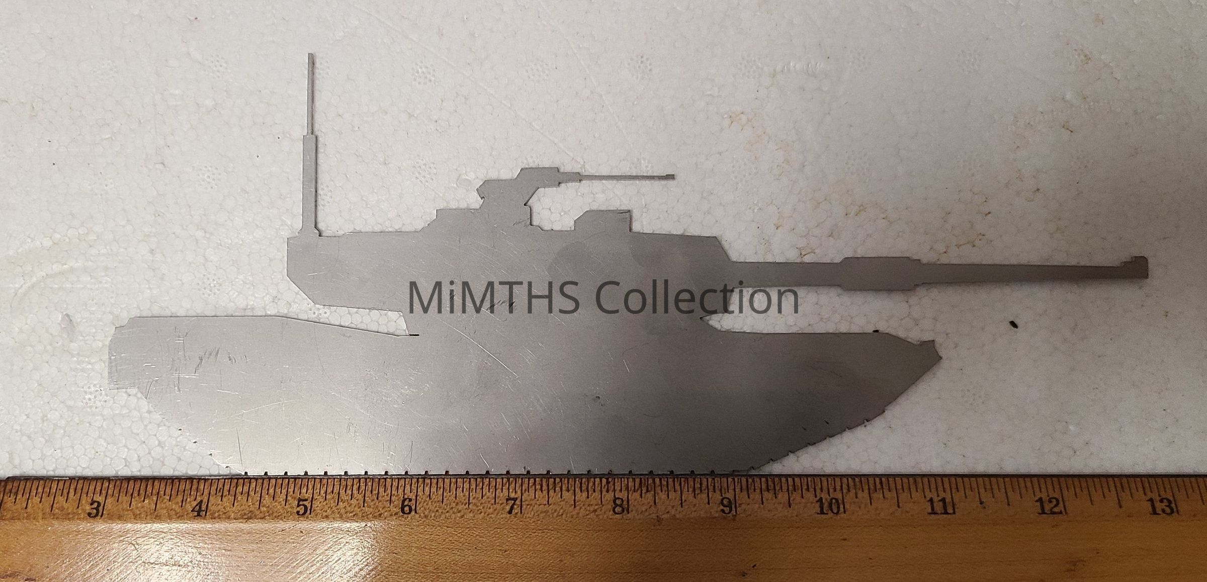 Stainless steel M1 Abrams Silhouette laser cut by the Kansas National Guard Advanced Turbine Engine Army Maintenance (ATEAM) at Ft. Riley KS. The ATEAM was overseen by TACOM Warren ILSC Abrams Mobility team / Abrams Engine Team.