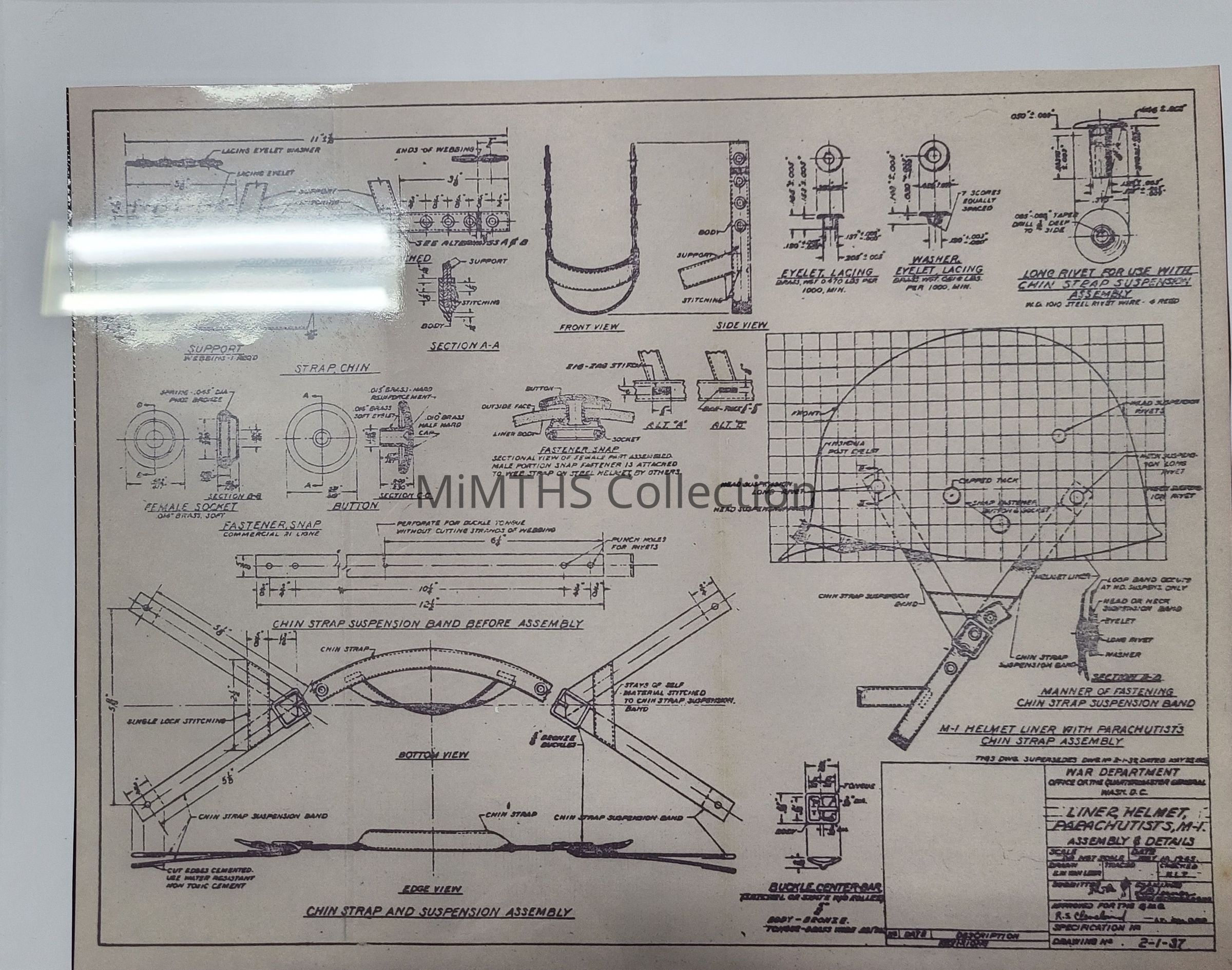 Reprint of the War Department assembly blueprint for the M1 Airborne Helmet Liner Chinstrap BlueprintCataloged By