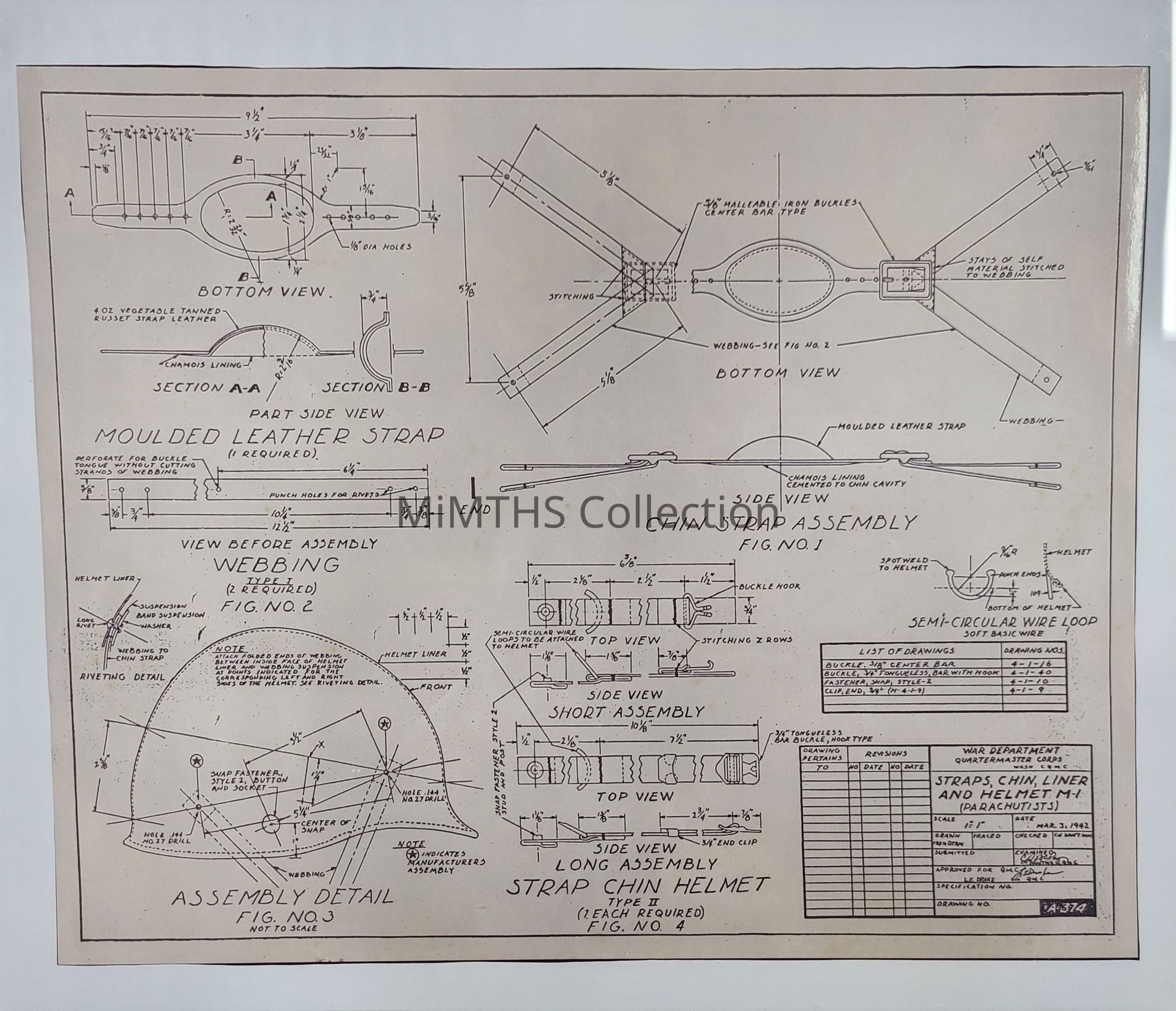 Reprint of the War Department assembly blueprint for the M1 Airborne Helmet Liner Chinstrap BlueprintCataloged By