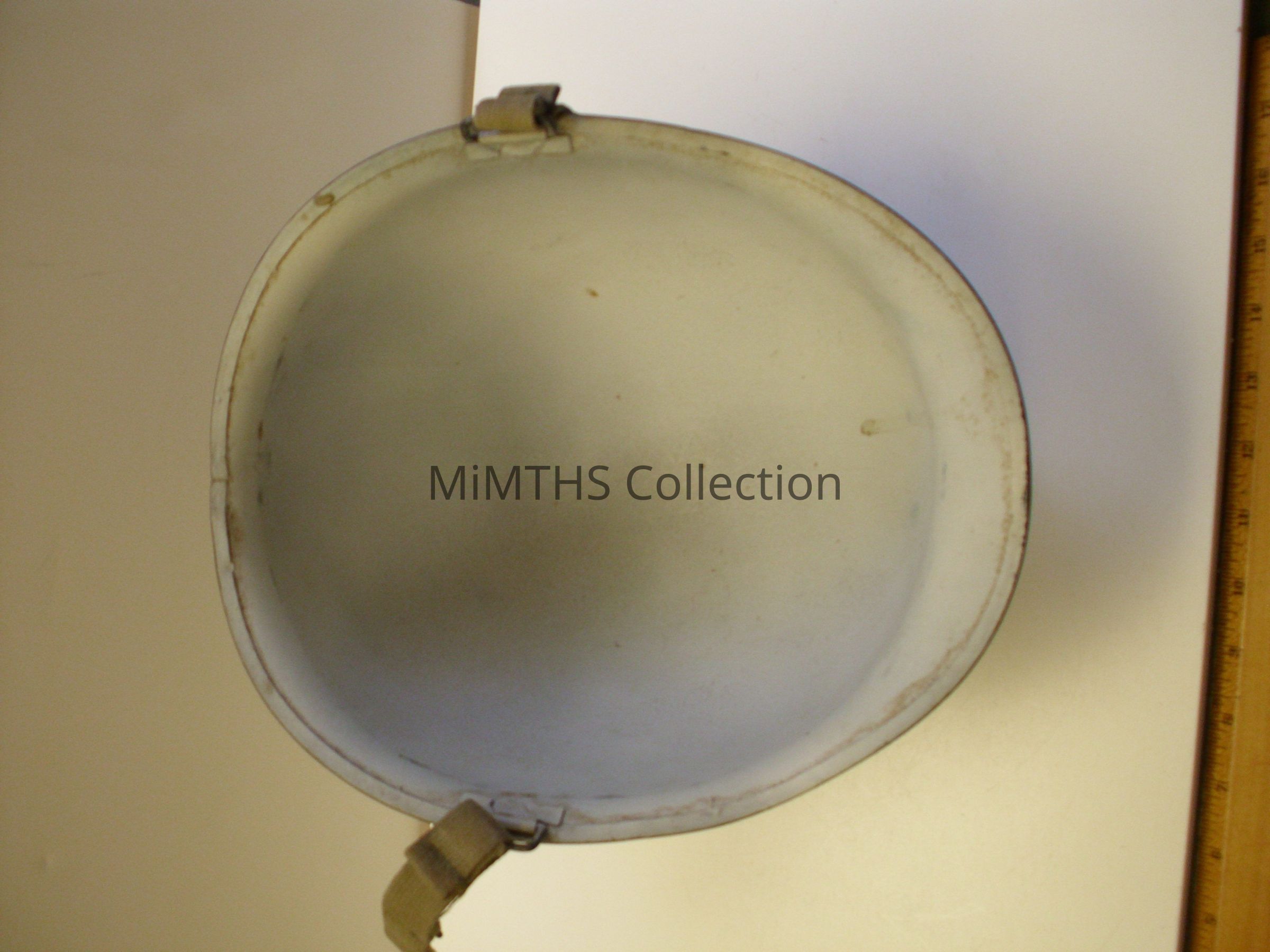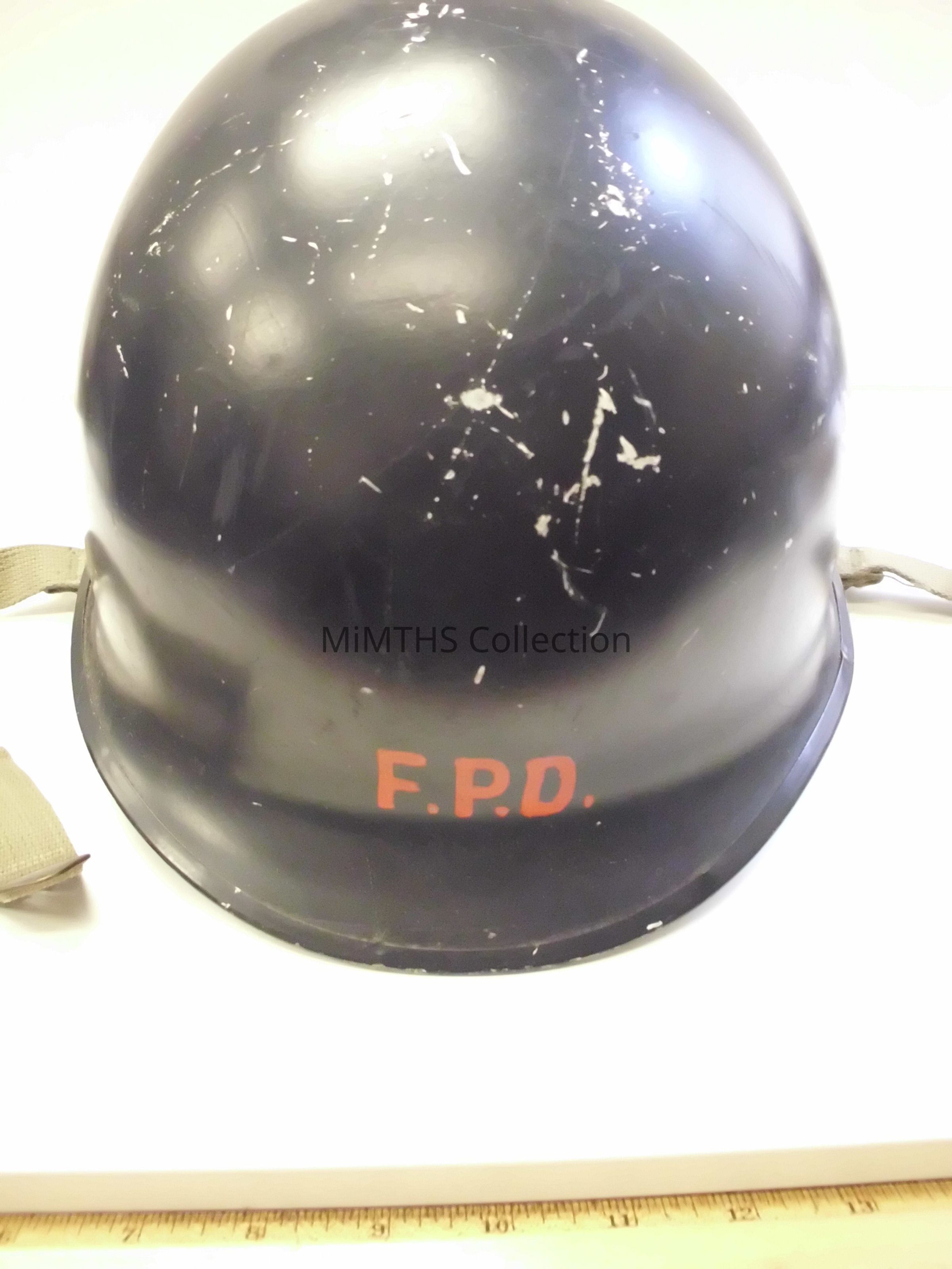 WWII era M1 helmet, rear seam, swivel bale, painted blue and marked F.P.D. Supposed ly issued to the Flint Police during the 1967 Detroit Riots "Just in case"Cataloged By