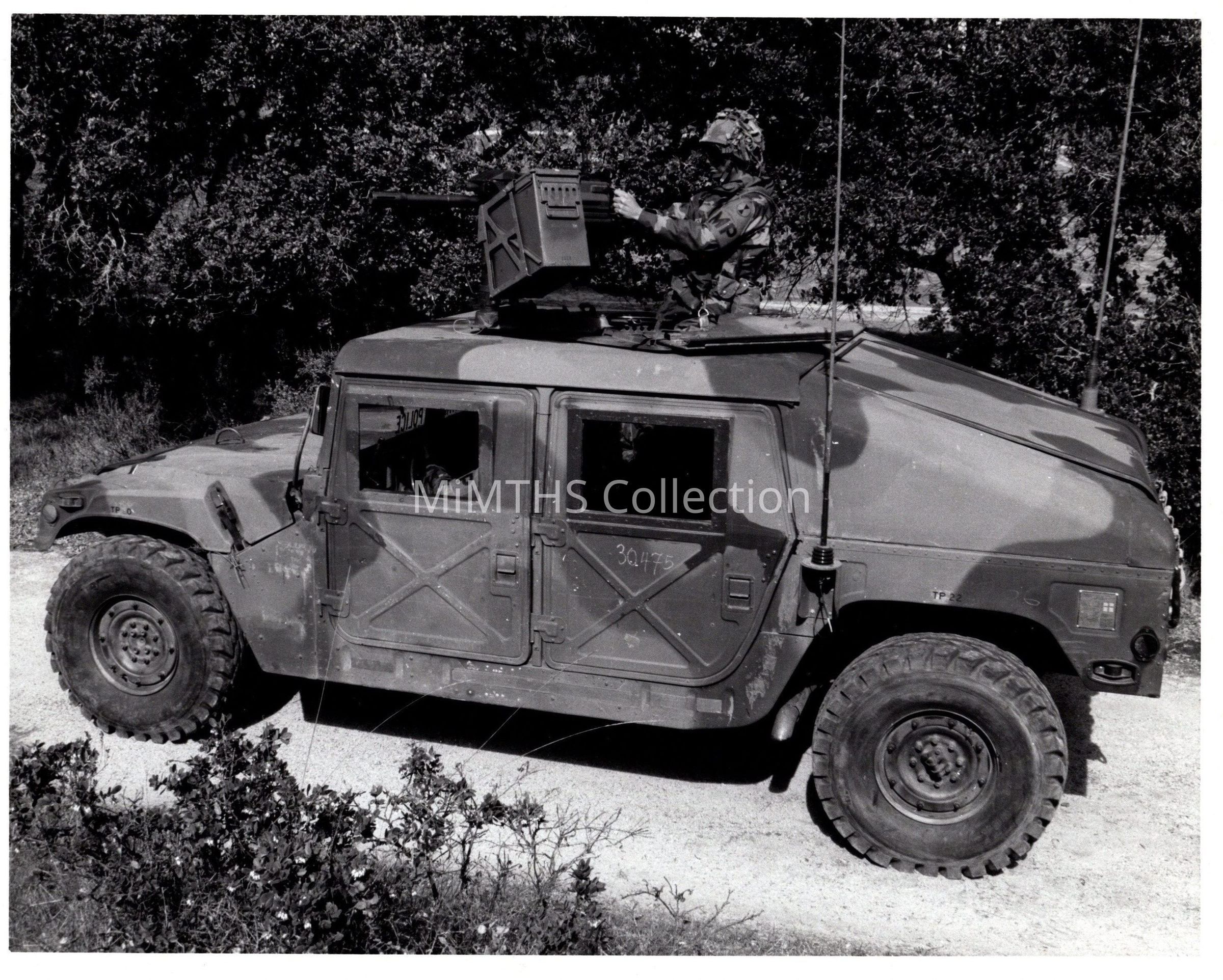 B&W photo of an M1025 HMMWV in 3 color cammo with a Mk19 grenade launcher mounted.