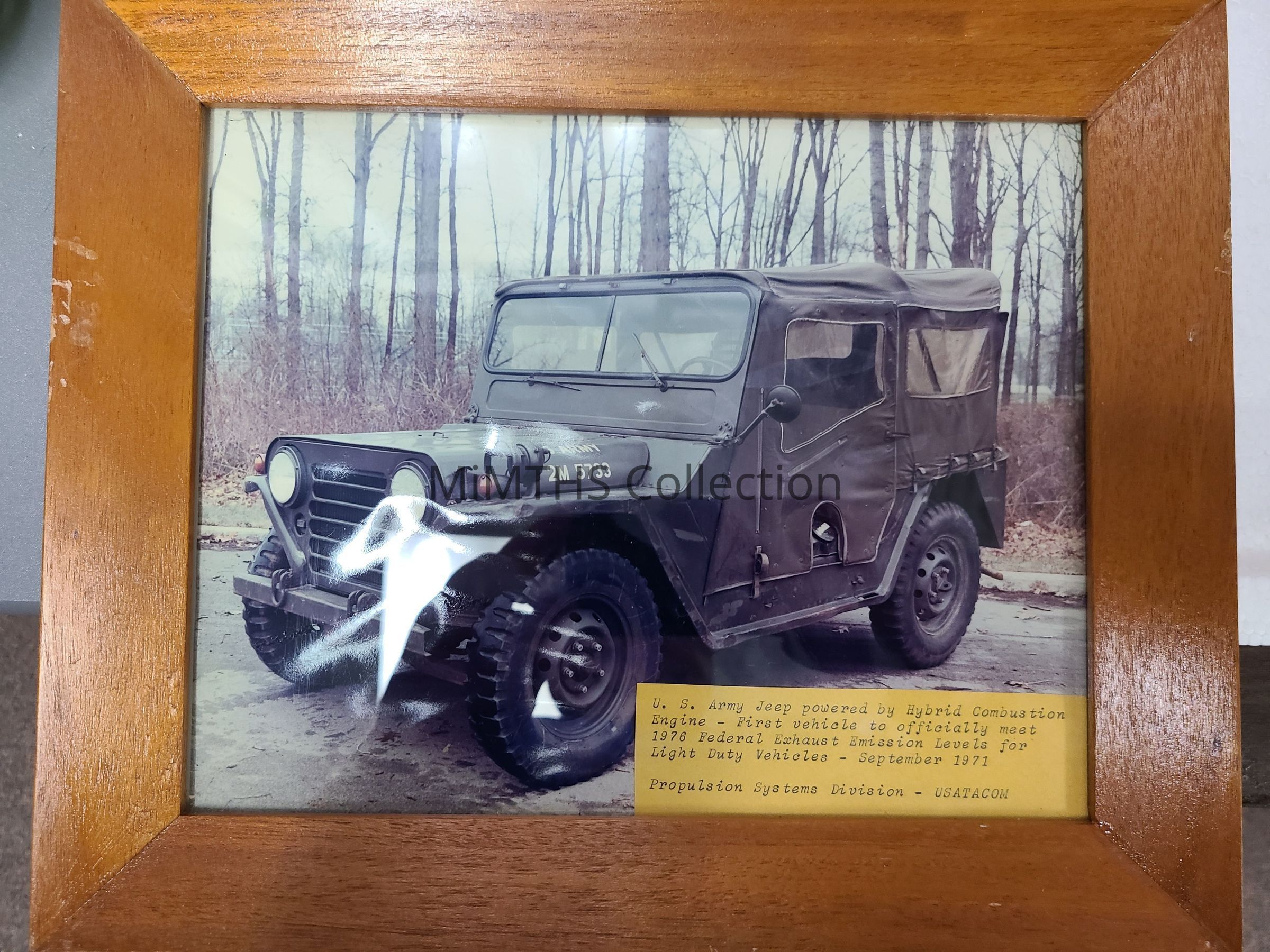 Framed 8"x10" photo of an M151 "Jeep" which was powered by a Hybrid Combustion Engine, the first Army vehicle to meet the 1976 Federal Exhaust Emission Standards. Photo is take in September 1971 and marked to the Propulsion Systems Division US Army TACOM. Back of the frame is marked AMSTA-RGR, March 1972.Photograph Details