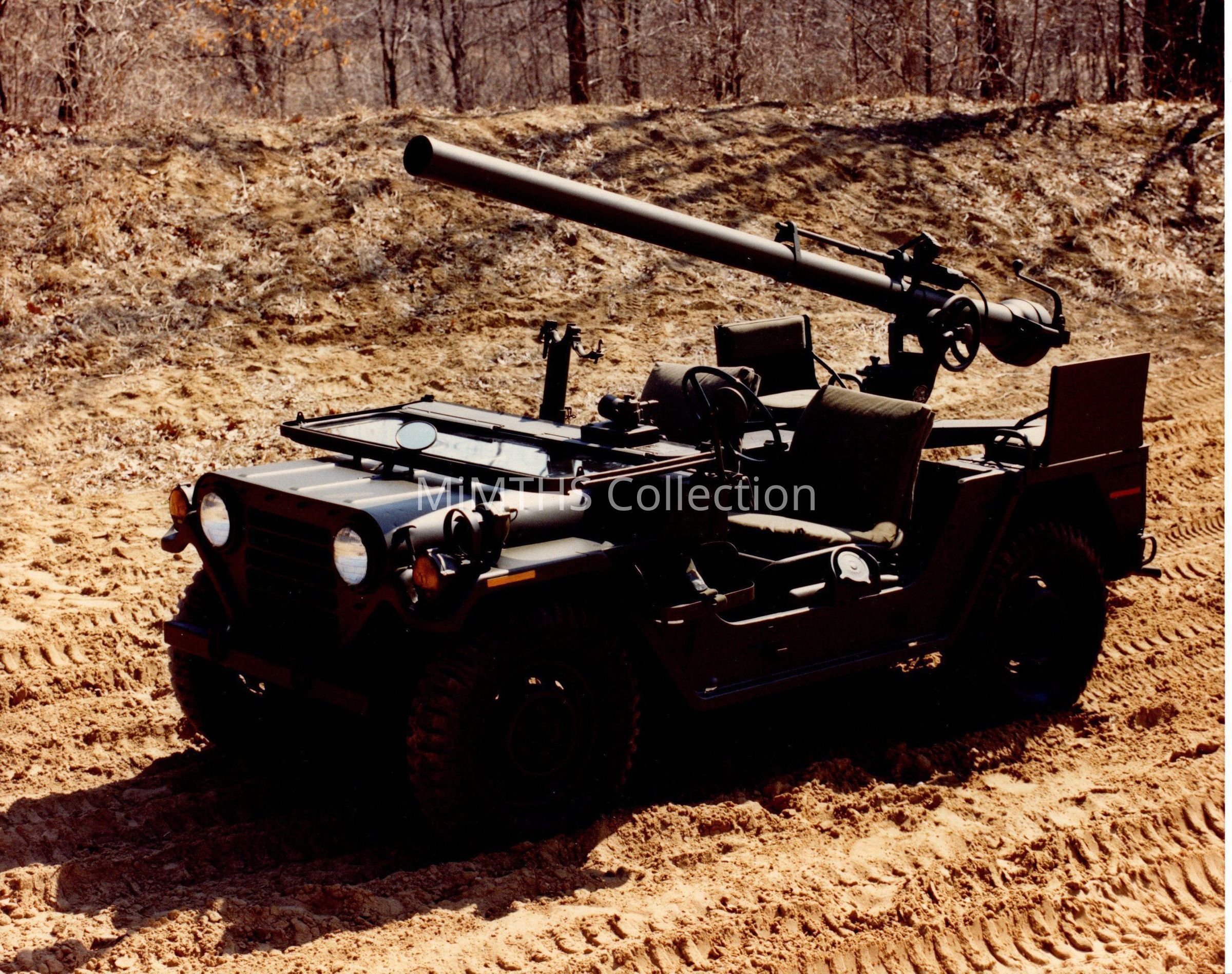 Color photo of an M151A2C "MUTT" or "jeep" with 106MM Recoilless Rifle Mounted