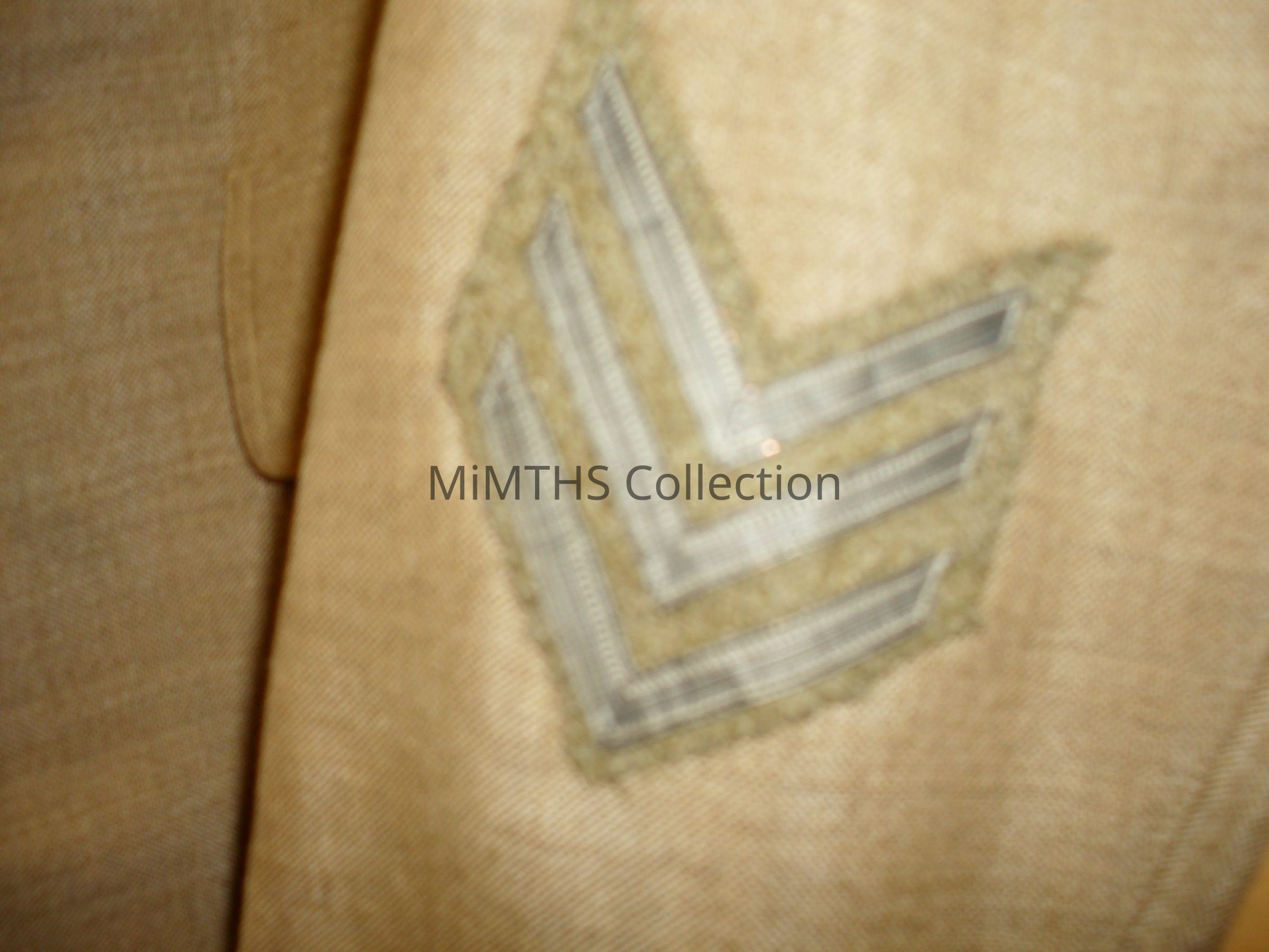 This uniform is from a Sergeant in Company B of the 10th Infantry Regiment. The three overseas stripes on the left sleeve show this was a veteran with 18 months of overseas duty. Based on this we can assume this uniform belonged to one of the veteran cadre that the 14th Infantry Division was formed around.